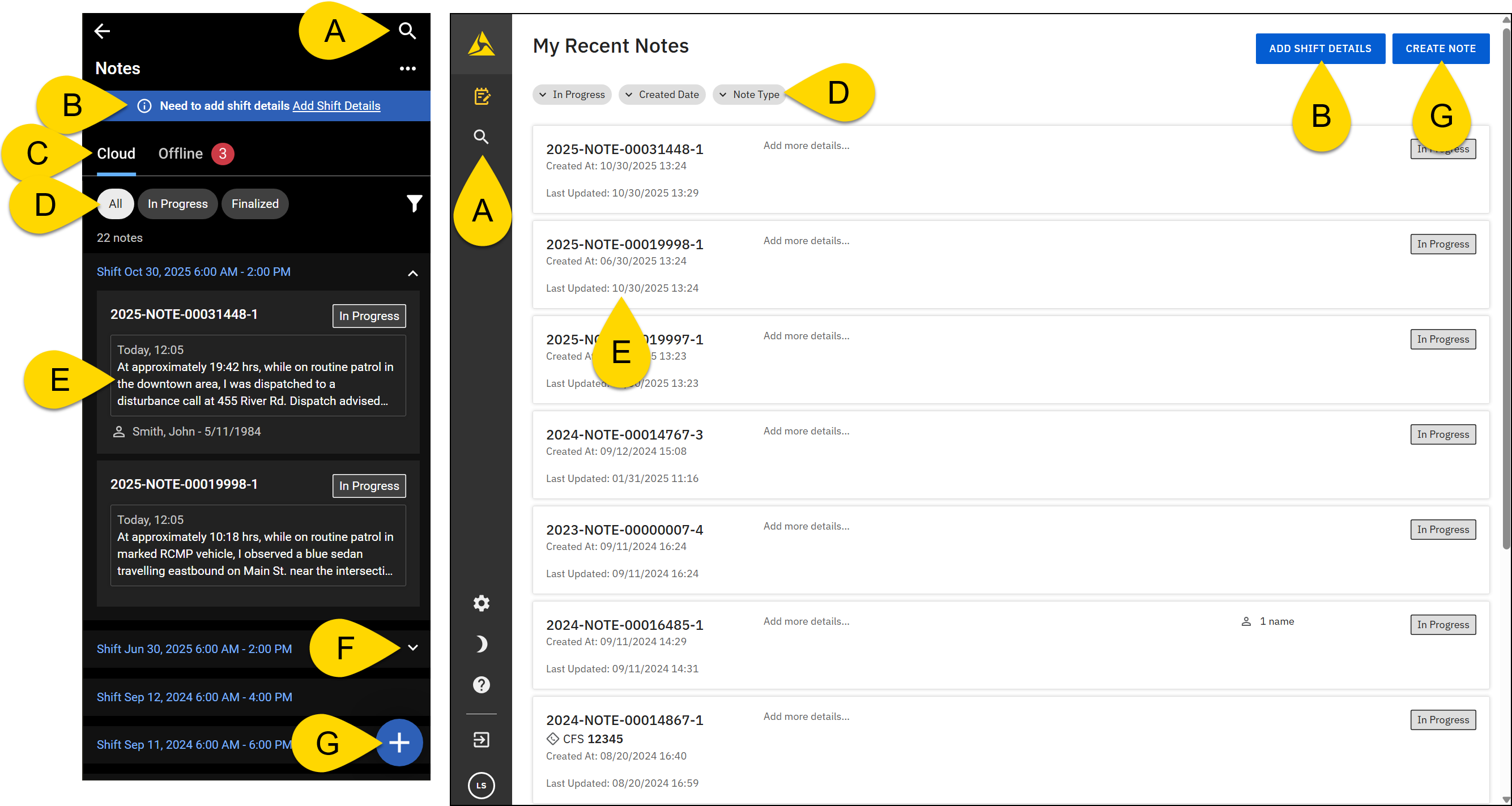 The Axon Notes Module lets you quickly create and finalize field notes throughout your shift from either a mobile device or a computer. If you temporarily lose network connectivity, you can continue working offline and sync your changes and finalize your notes when you are back online. After a note has been finalized, supplements can be added, and the note can be shared with external partners. You can search for a note by using Notes search.
