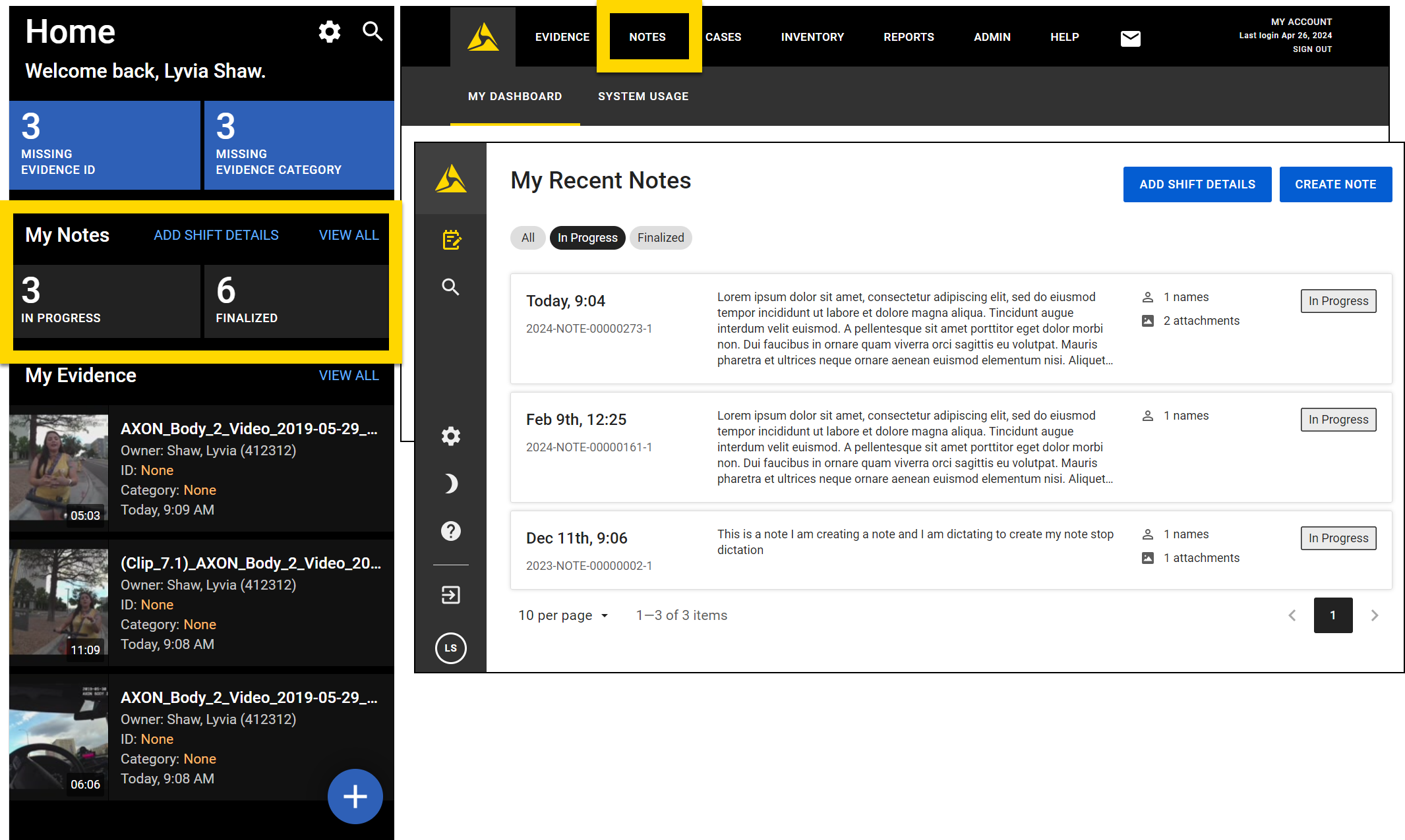 To access Notes on a mobile device, open the Axon app and in the My Notes section, select the In progress or Finalized buttons to view those notes with those statuses or View all to see all notes. To access Notes on a computer, log in to Axon Evidence and select Notes in the main navigation menu.