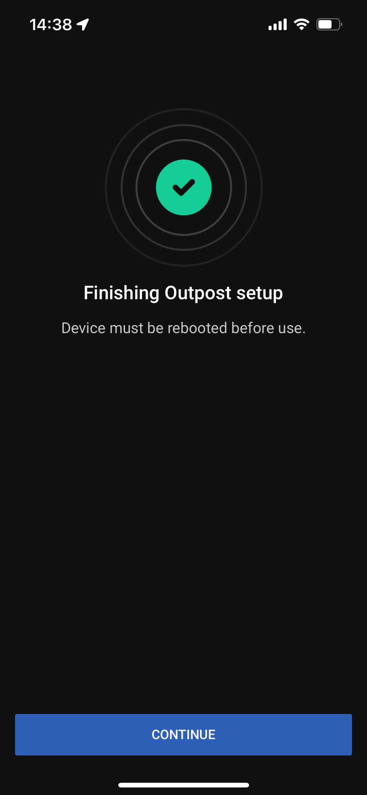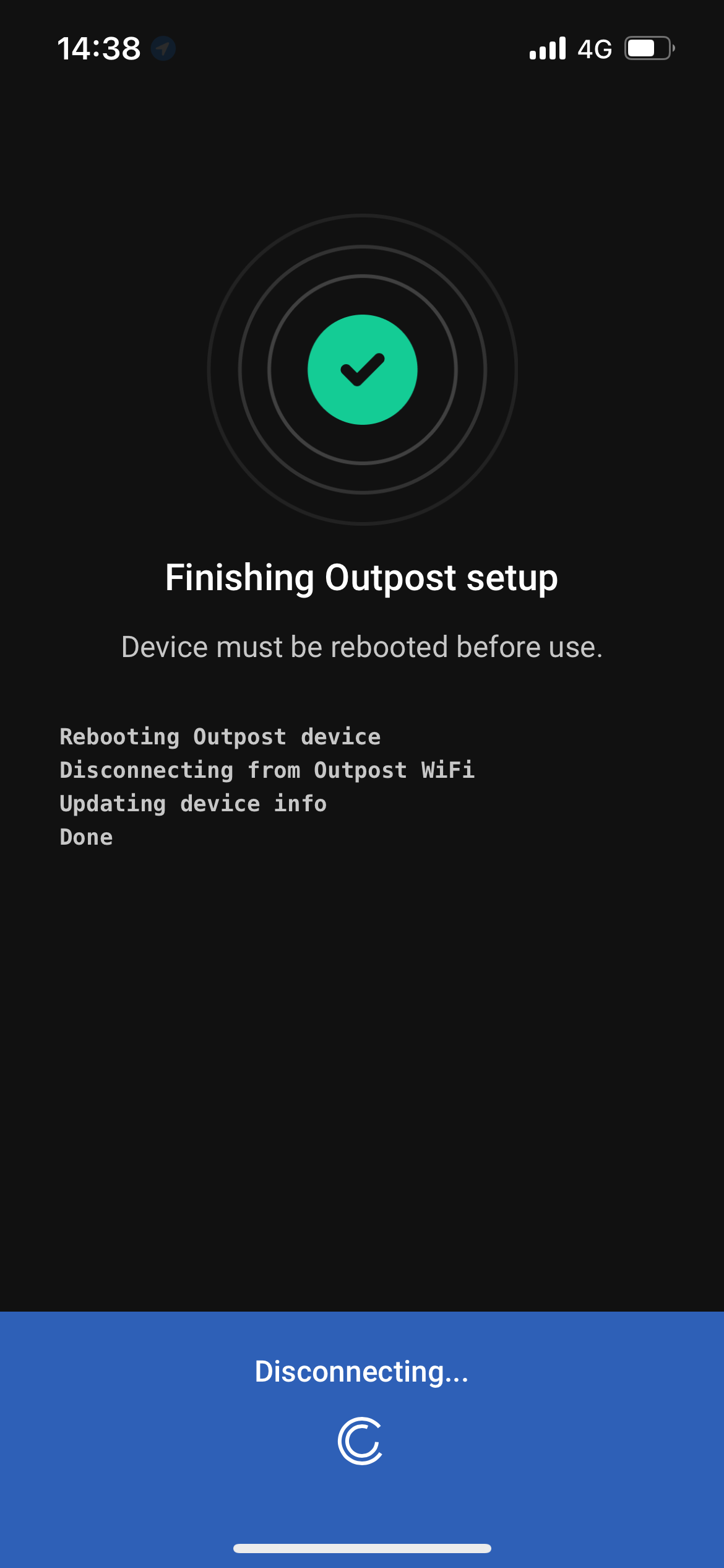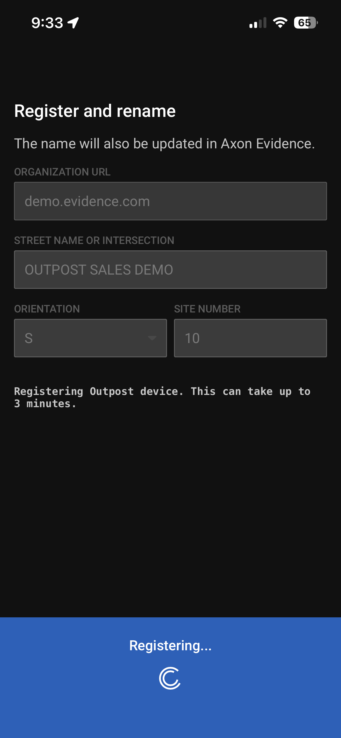 The registration process may take up to three minutes. Once the device is successfully registered, a message reports "Outpost registered to agency" and the LED ring displays an animated rainbow pattern
