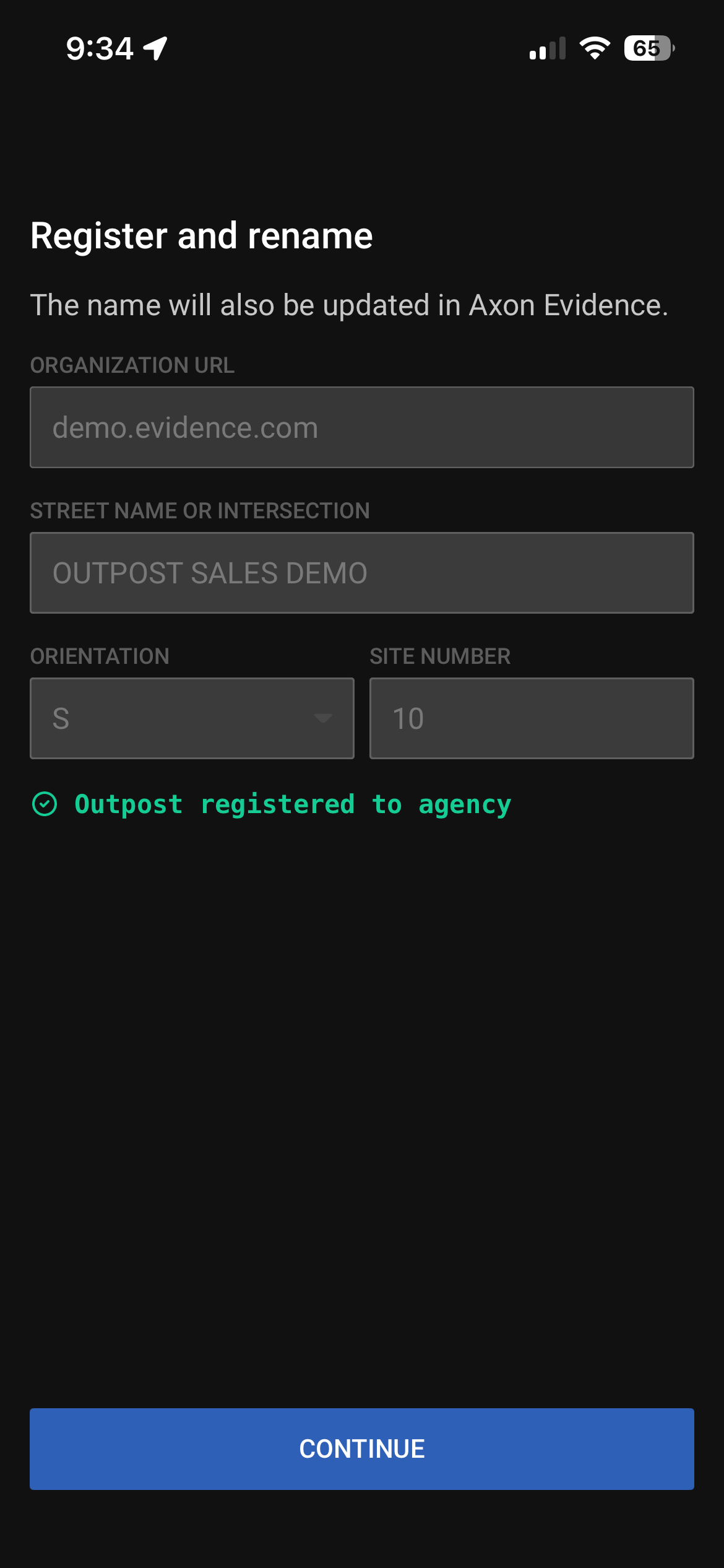 After setting up the Axon Outpost camera, assign it a name that corresponds to its location for easy identification. After saving, the device will register to the Axon Evidenceaccount, appear in the device inventory, and automatically apply all organizational settings.