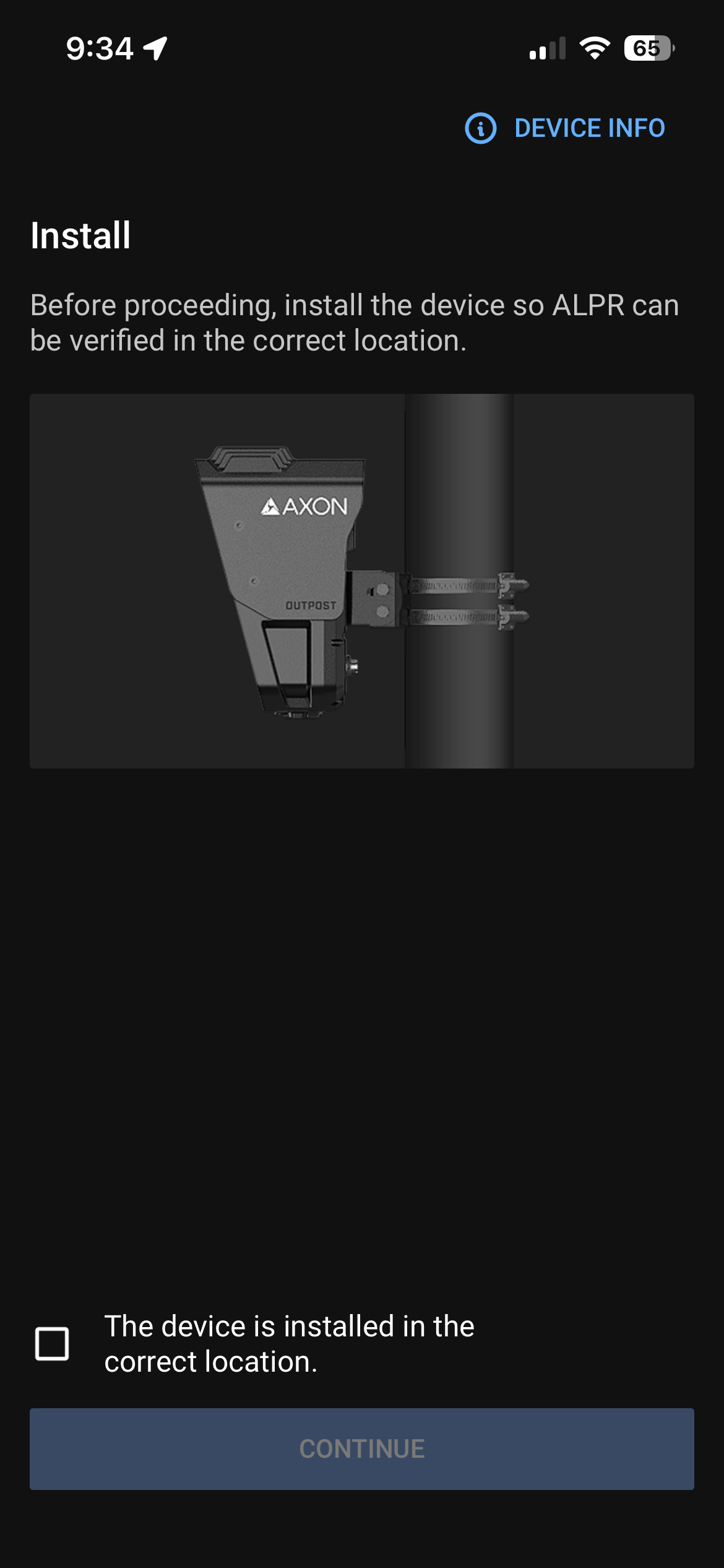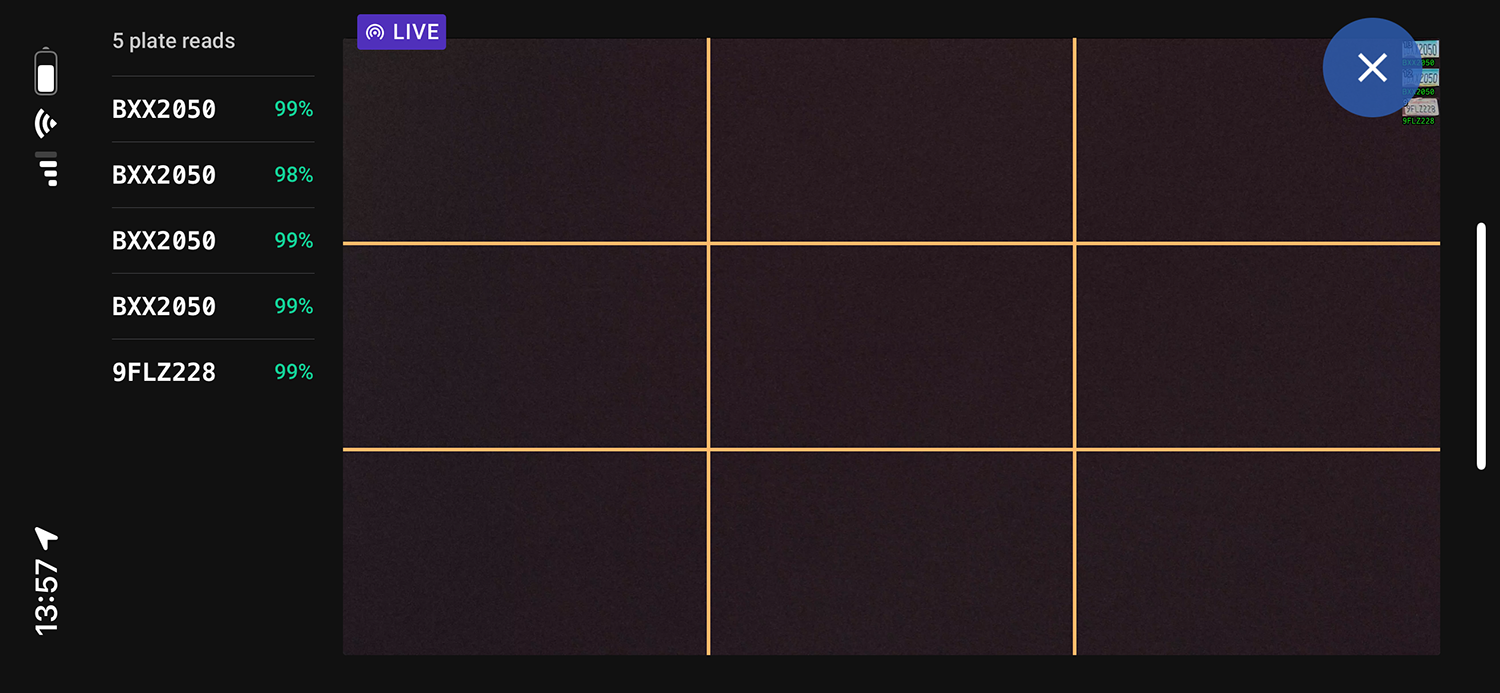 - The app starts a live view of the camera and an ALPR test to assist with Axon Outpost positioning and orientation.
