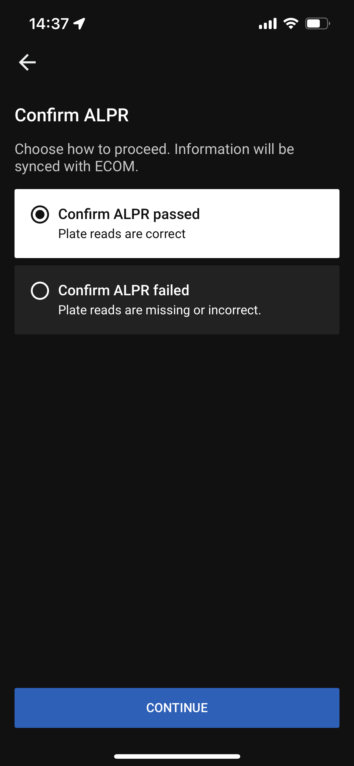 - Confirm the ALPR test passed and select Continue. If the ALPR test failed, skip to next step.