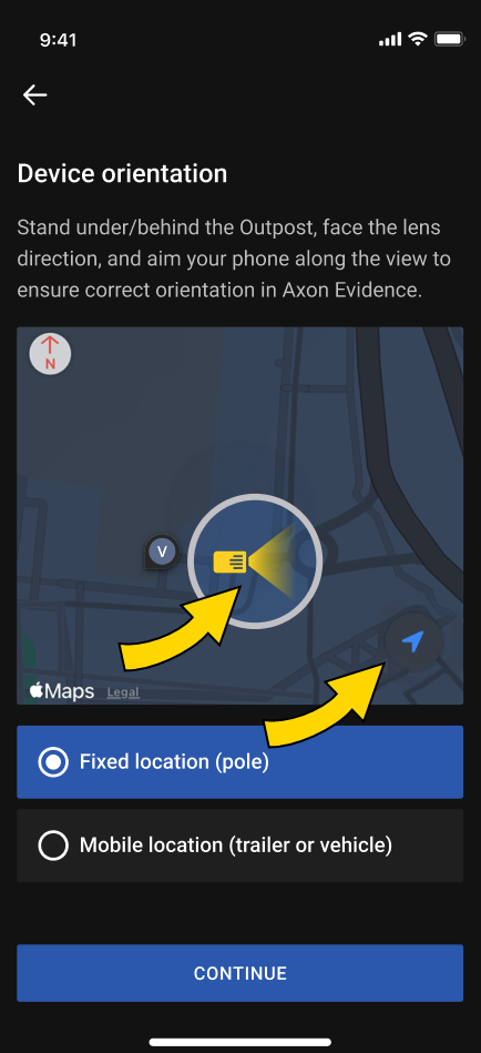 - Hold your phone with the screen facing upward and rotate the phone to align the on-screen direction indicator with the direction Axon Outpost is pointing (left arrow below).