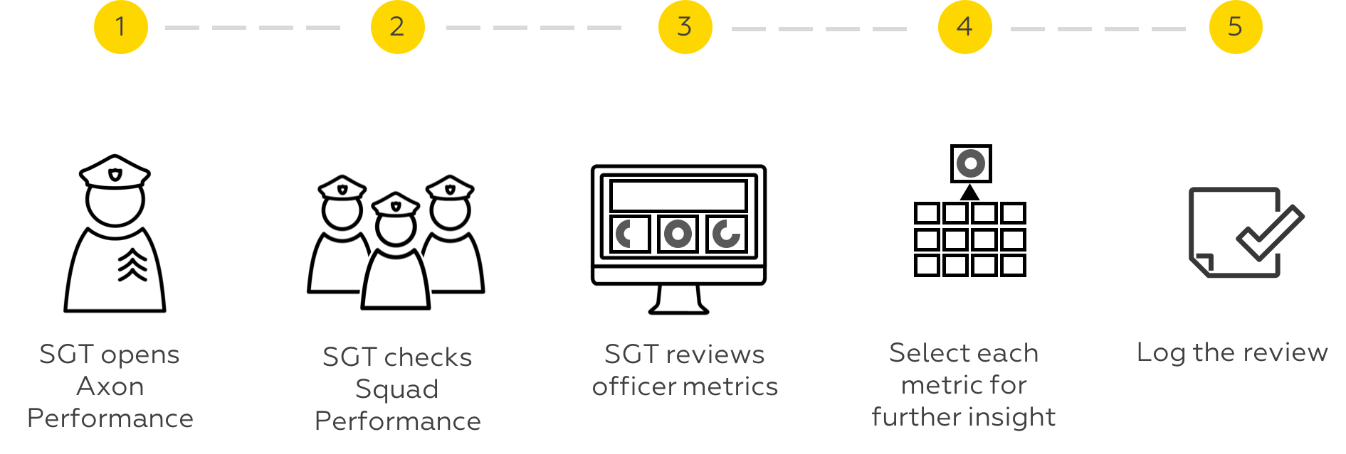 Axon Performance is designed to reduce the amount of time field supervisors spend reviewing compliance with agency policies and programs. With Axon Performance, agencies streamline the supervisor review and enable supervisors to deliver tailored personnel training and feedback to ensure that teams are operating within agency guidelines and policies.