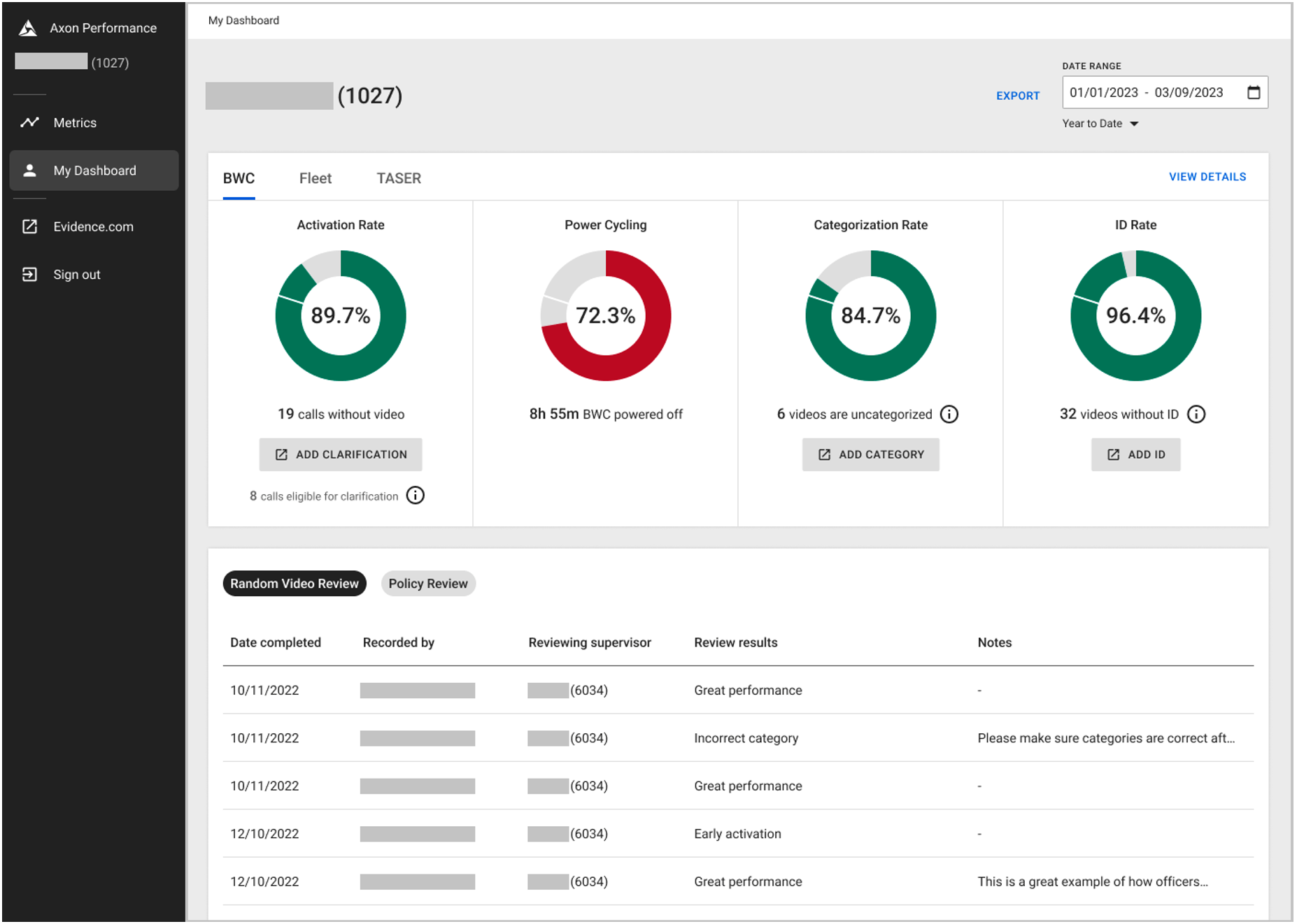 Frontline officers can access a page within Axon Performance called My Dashboard to monitor their personal metrics, view the video audits that their supervisor performed for them, and provide clarifications for service calls which didn't include an activated camera.