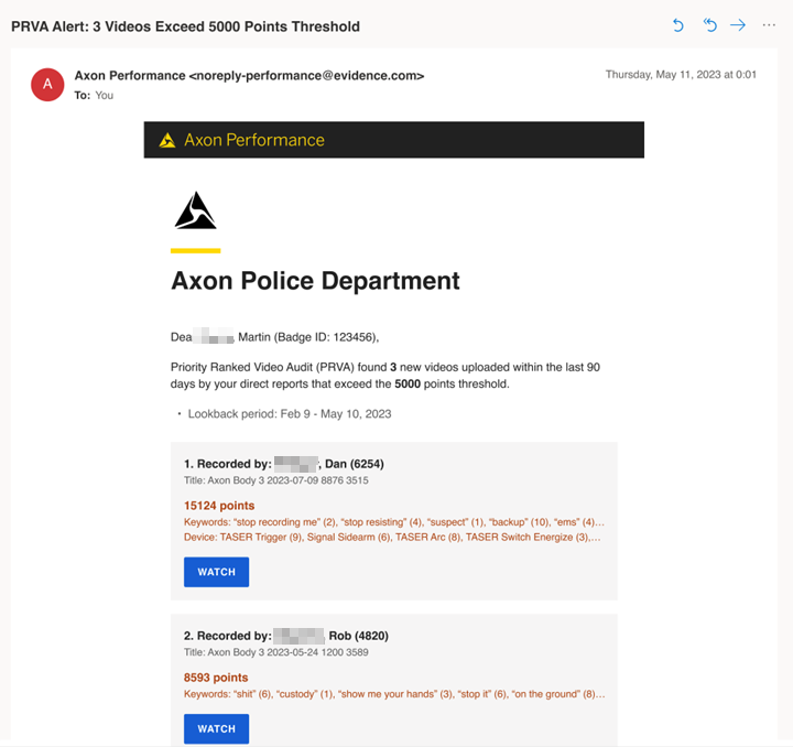 Upon activation, direct supervisors receive notifications for videos uploaded by their officers that meet or exceed the PRVA score. Designated CC recipients also receive these notifications. Email notifications have the following format: [X videos exceeding Y points], and they are sent from Axon Performance <[email protected]>.
