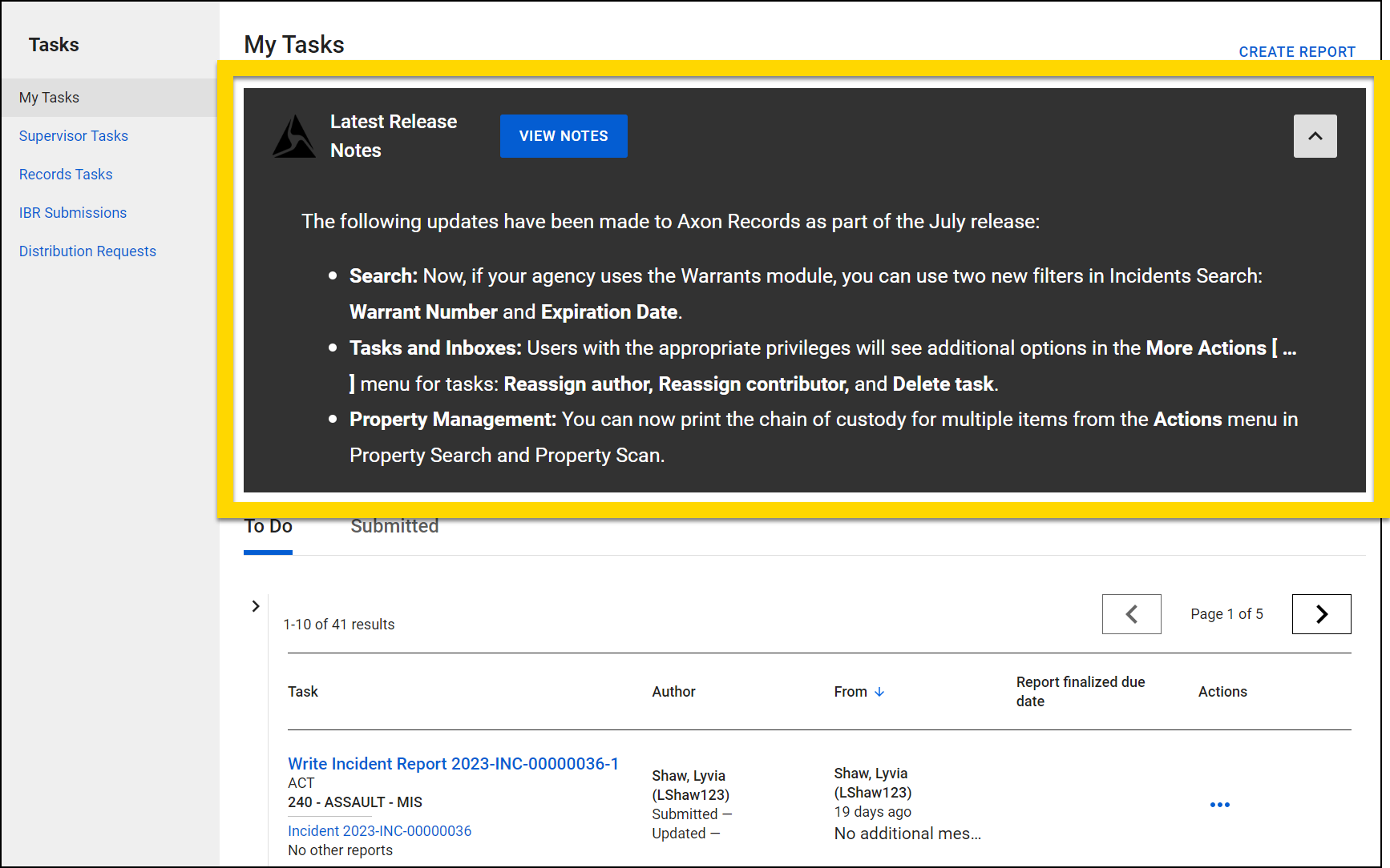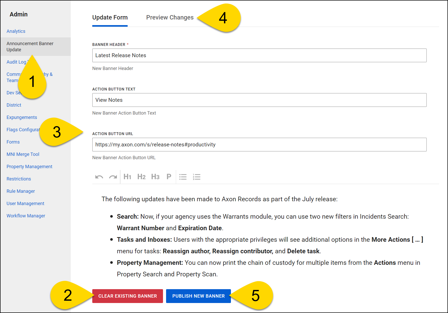 Using the Announcements Banner Update tool in the Administrator Console, you can customize the content of the announcements banner that appears at the top of the My Tasks inbox in Axon Records and Axon Standards.