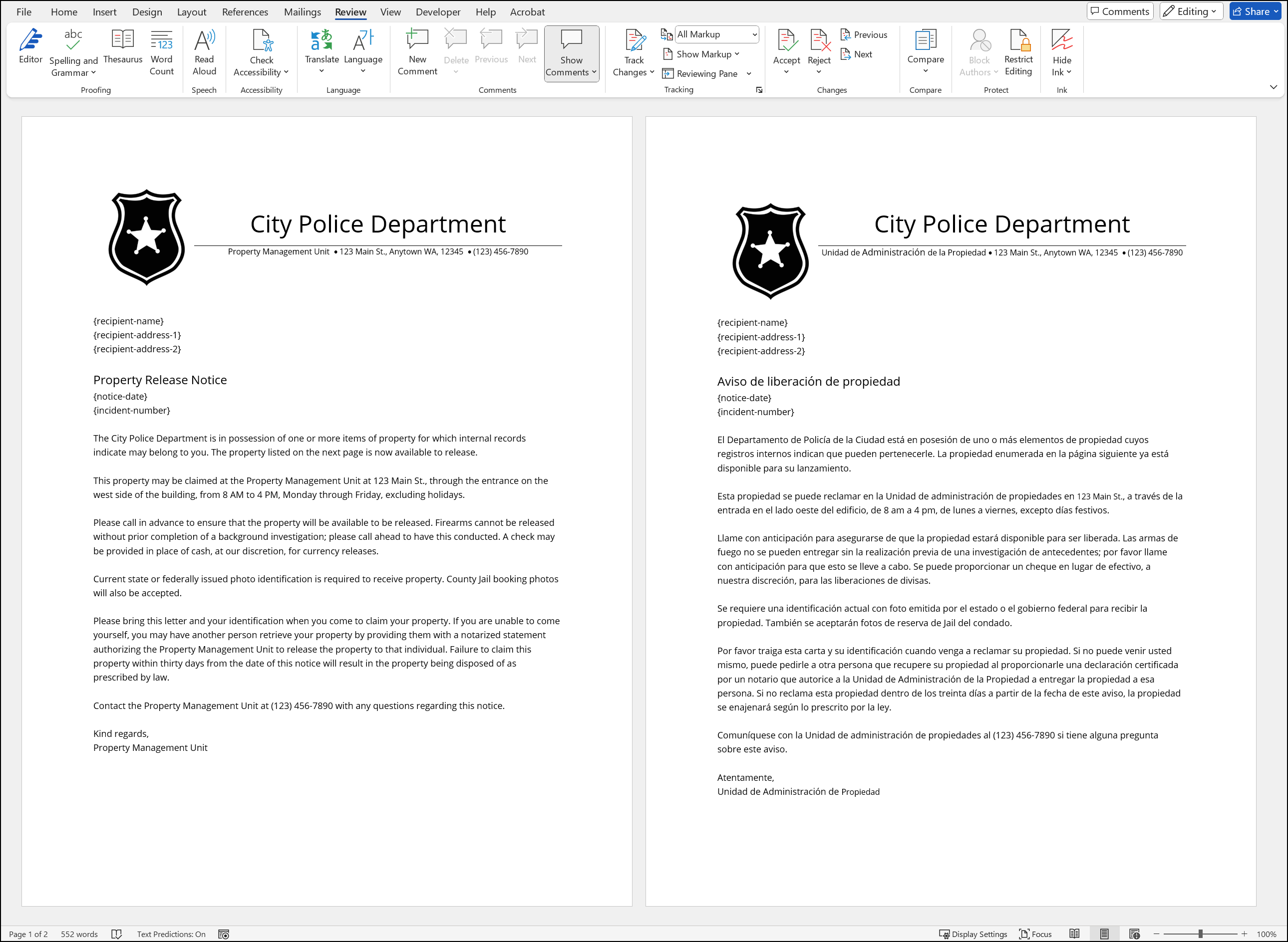The template includes some text in curly brackets. When the notice is printed, this text will update with the recipient’s information and the notice date, so be sure not to change this text. You can, however, move this text so the page can be folded into a window envelope and the recipient’s information serve as the mailing address.