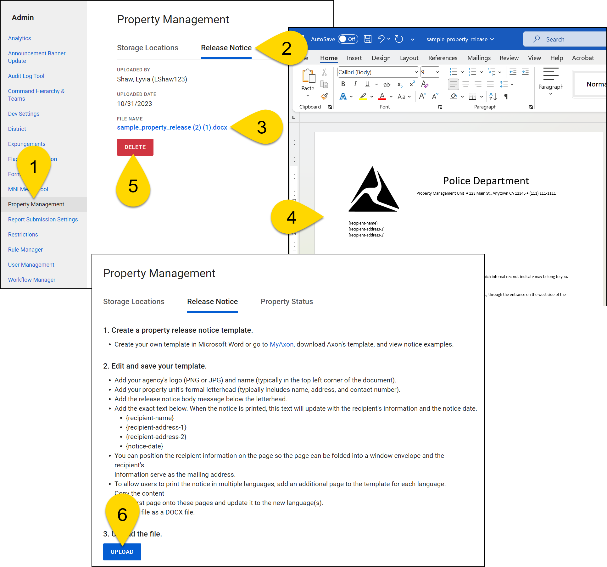 In Axon Records, users can create a property release notice letter to send to property owners when a piece of property that belongs to them is ready to be picked up.