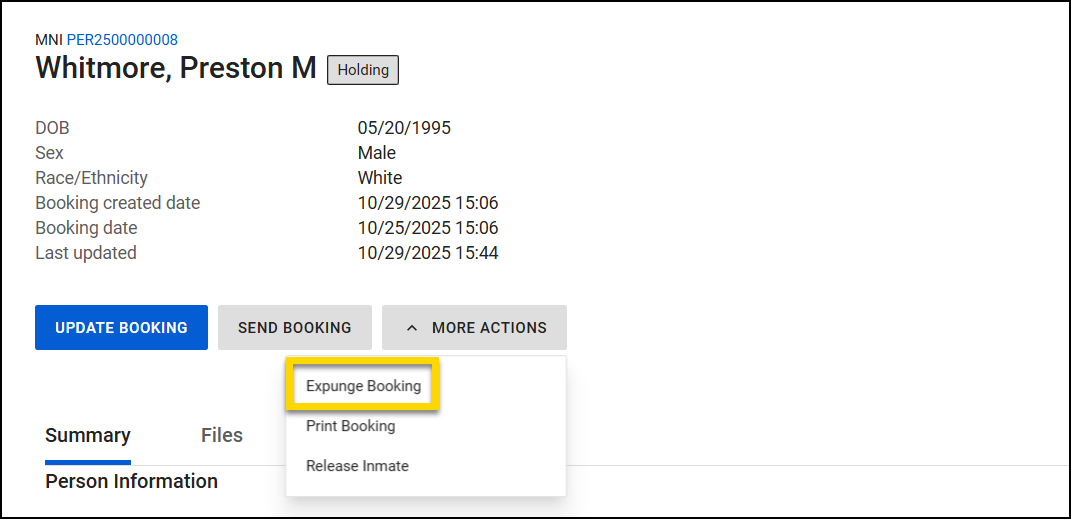 From the Booking profile, select More actions > Expunge booking, then follow the remaining steps explained in Expungements, beginning with Step 2.