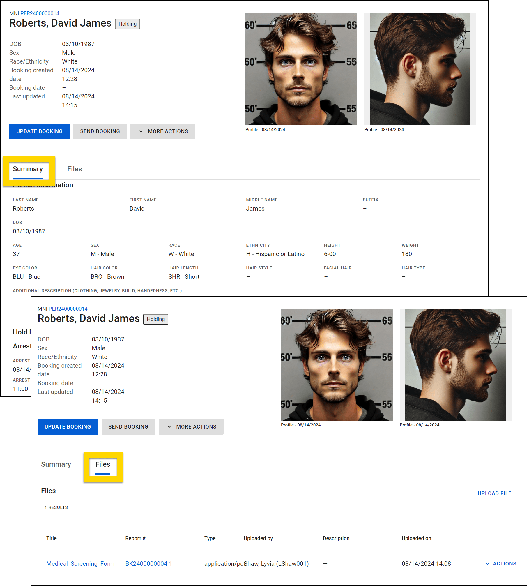 The Summary tab contains all the information from the booking intake report, and the Files tab contains all files that have been added for the inmate.