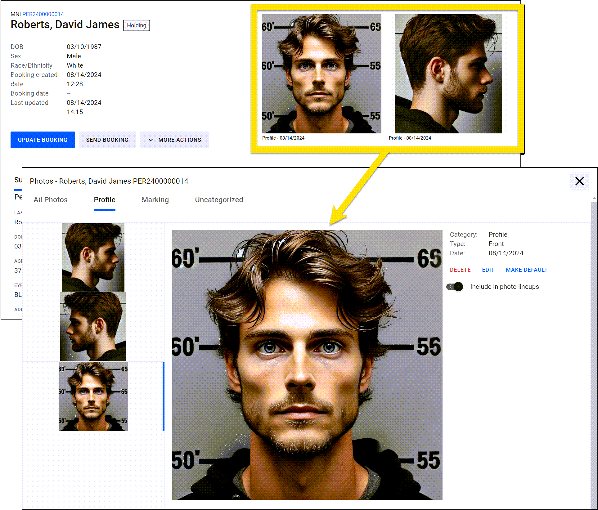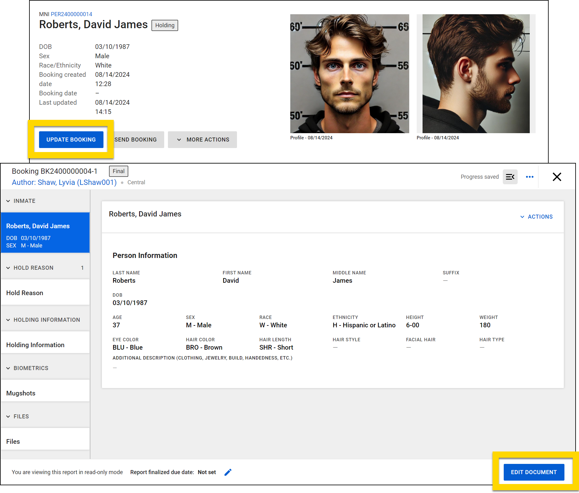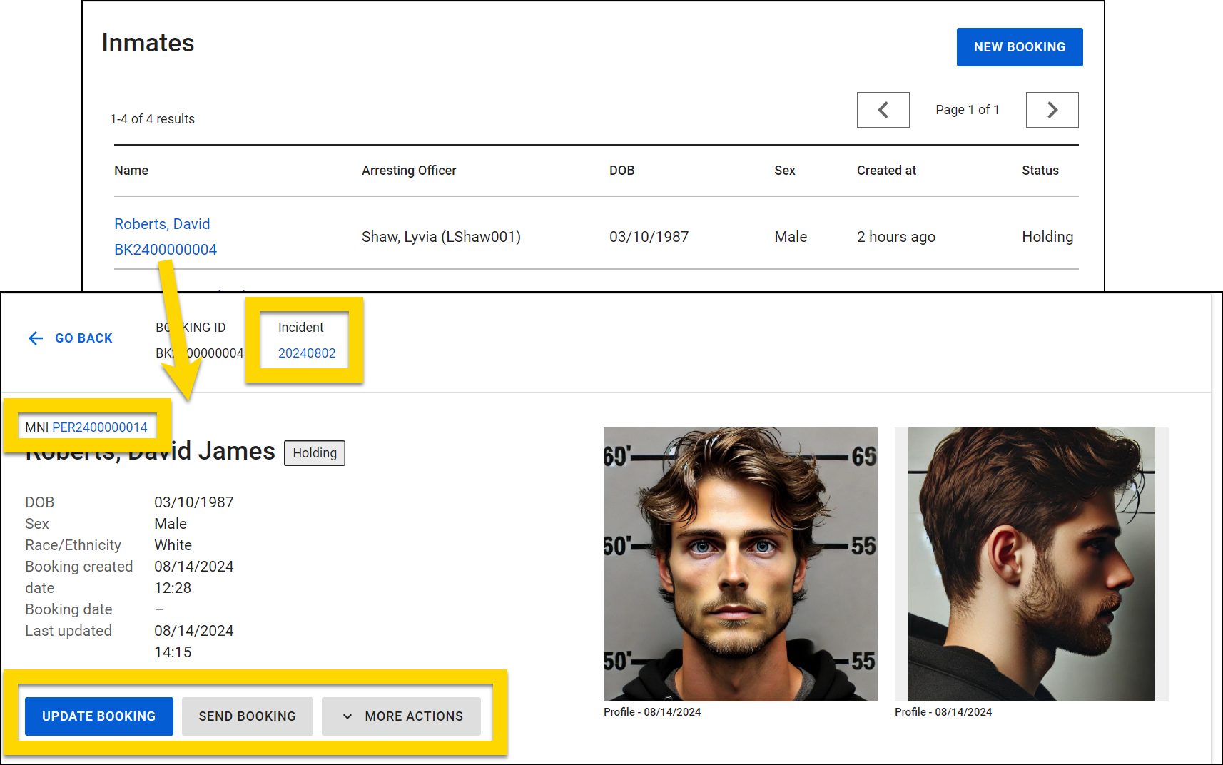 To add additional photos, select Update Booking and open the Mugshots section of the report.
