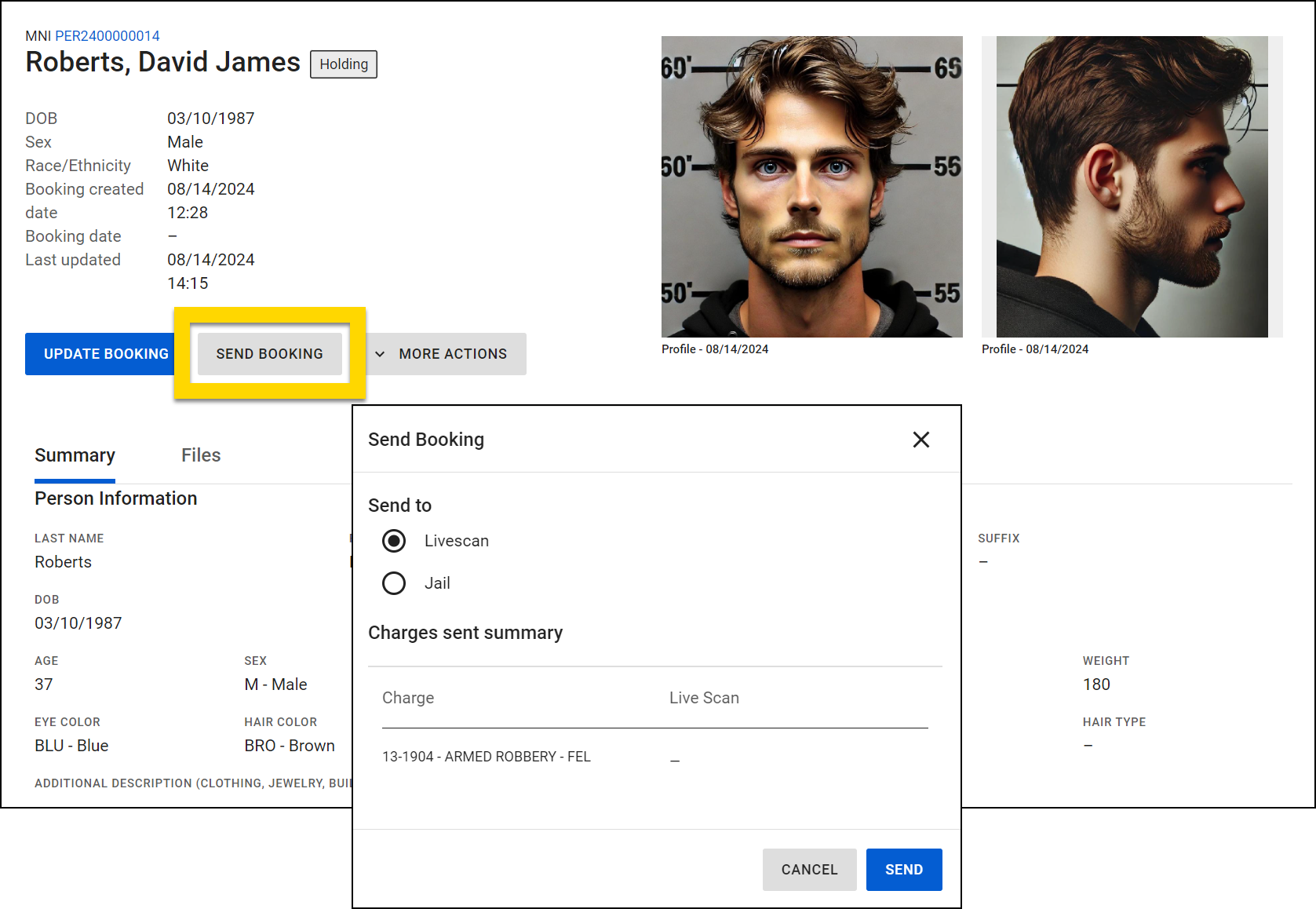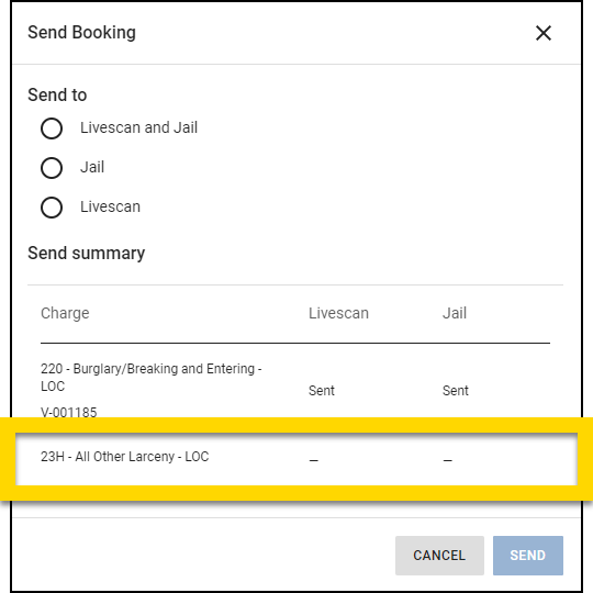 To send booking details to Livescan or a Jail Management System (JMS), select Send Booking. You can choose to send to Livescan, Jail, or both. Select Send Booking again at any time to view which systems have received the booking details.