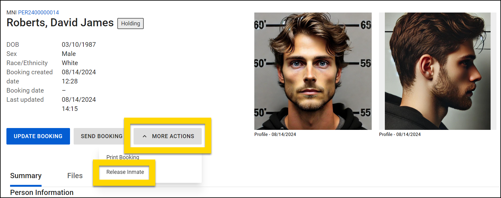 - Open the booking by selecting a name from the Inmates list.