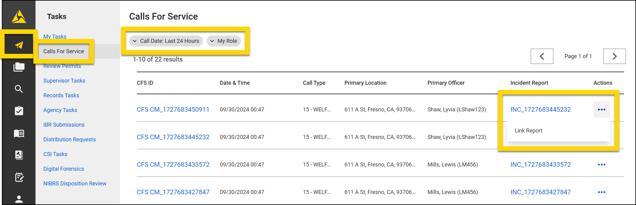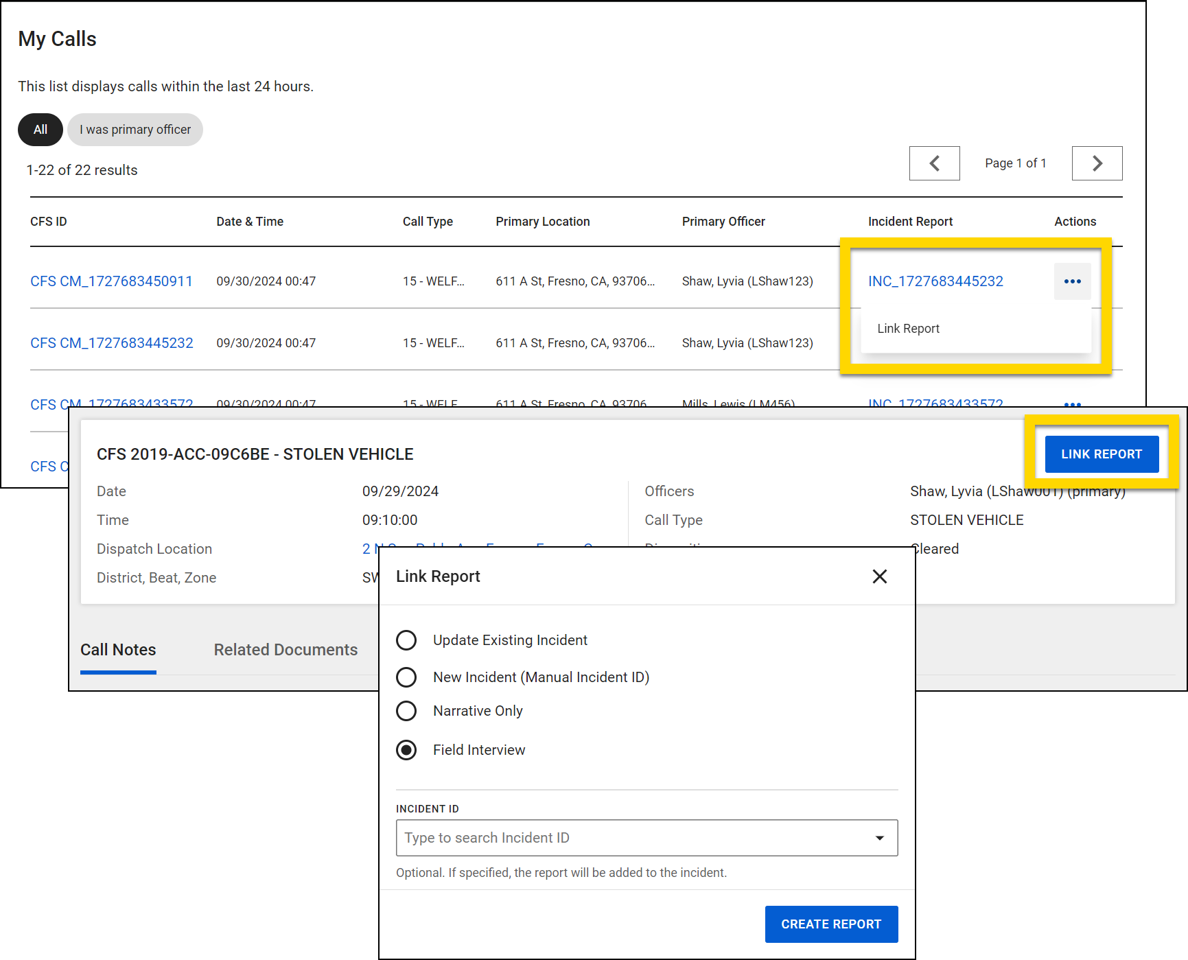 Select the CFS ID to open the CFS profile or the Incident ID to open the incident profile. Select More Actions [...] > Link Report to create a new report and link it to the call.