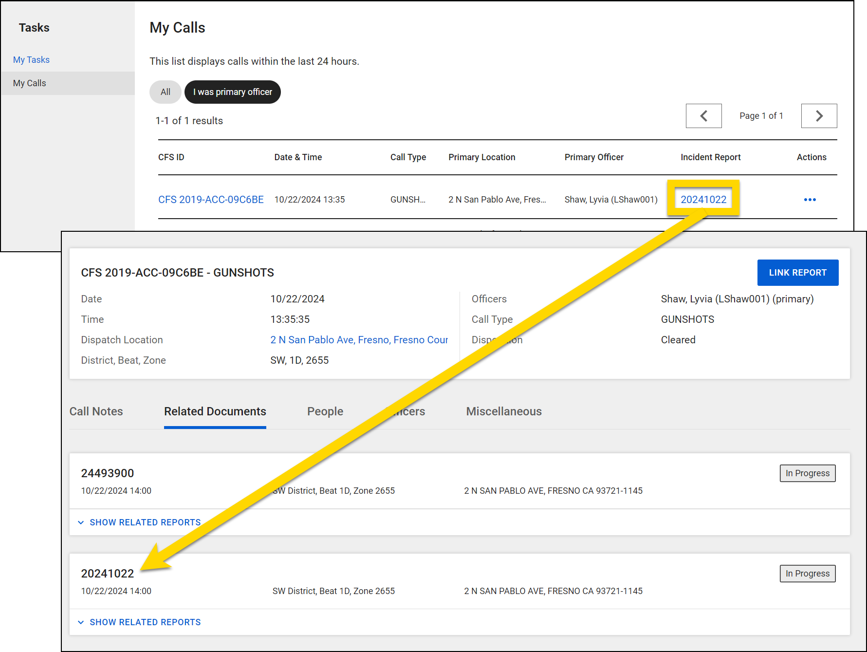 If a call is already linked to an incident, you can link it to a different incident or report. When you do this, the new Incident ID will appear in the Calls for Service inbox. However, the original incident the CFS was linked to will still appear on the CFS profile. Additionally, both incident profiles will display the same CFS ID.