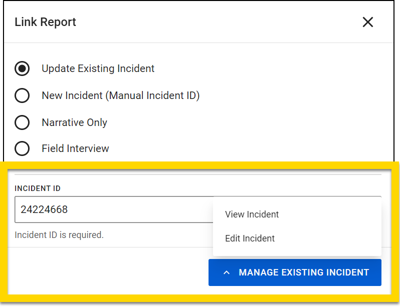 If you chose to link the CFS to an existing incident, you must join the incident as a contributor by selecting Manage Existing Incident > Edit Incident.
