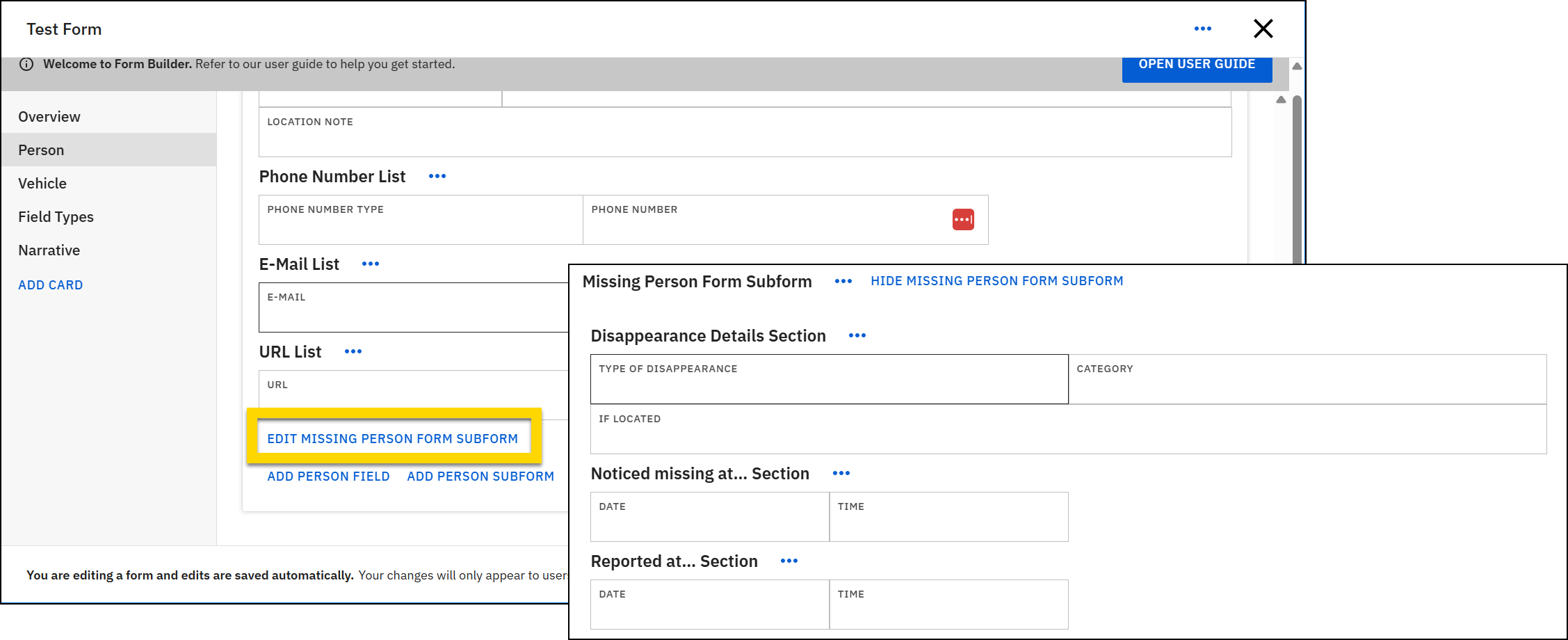 Subforms are specialized sections that can be added to Entity cards (person, vehicle, property) to capture detailed information. They allow you to edit information specific to one instance without affecting others.