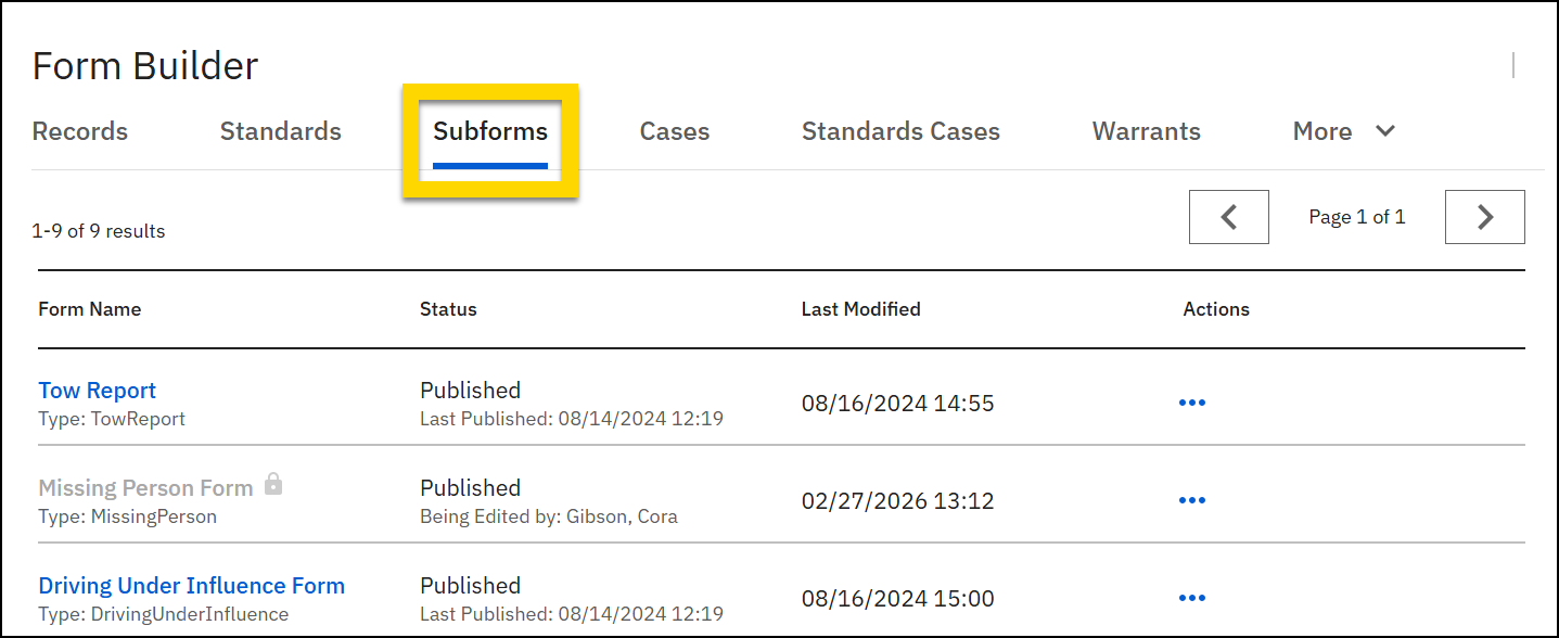 To edit a subform, open Form Builder, switch to the Subforms tab, and select the blue hyperlink form name. When editing a subform, you can: