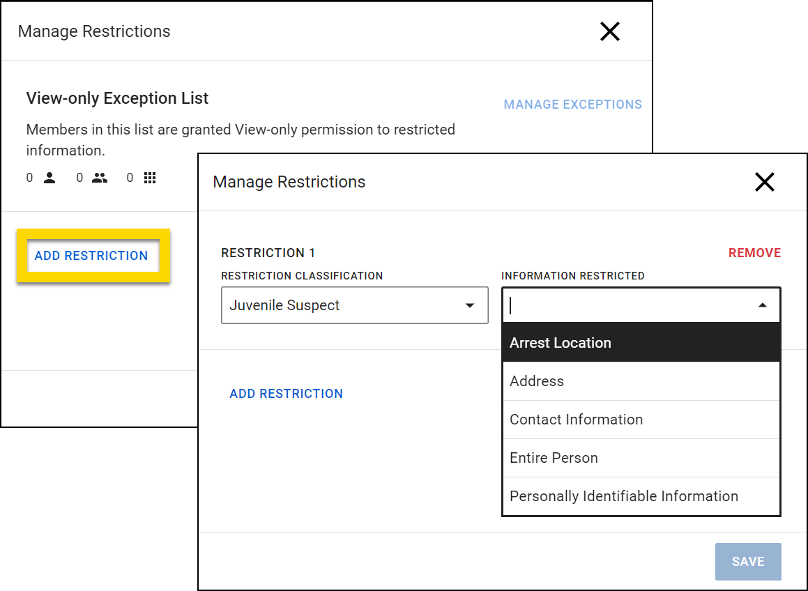 You can apply restrictions to an entire incident, an entire report, or to specific report sections, such as information about a person, vehicle, or property.