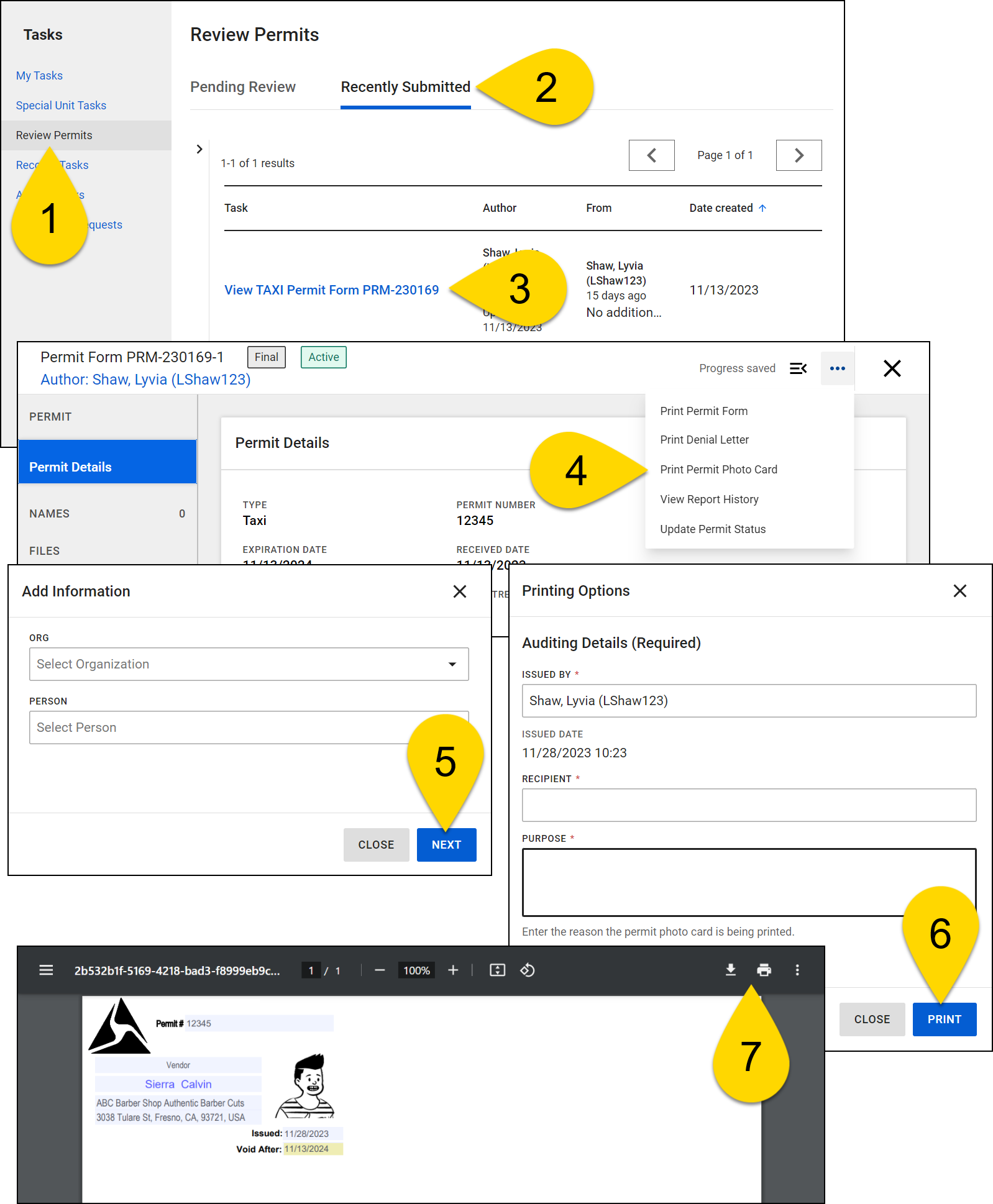 After approving a permit, you are returned to the My Tasks inbox. To print a permit photo card: