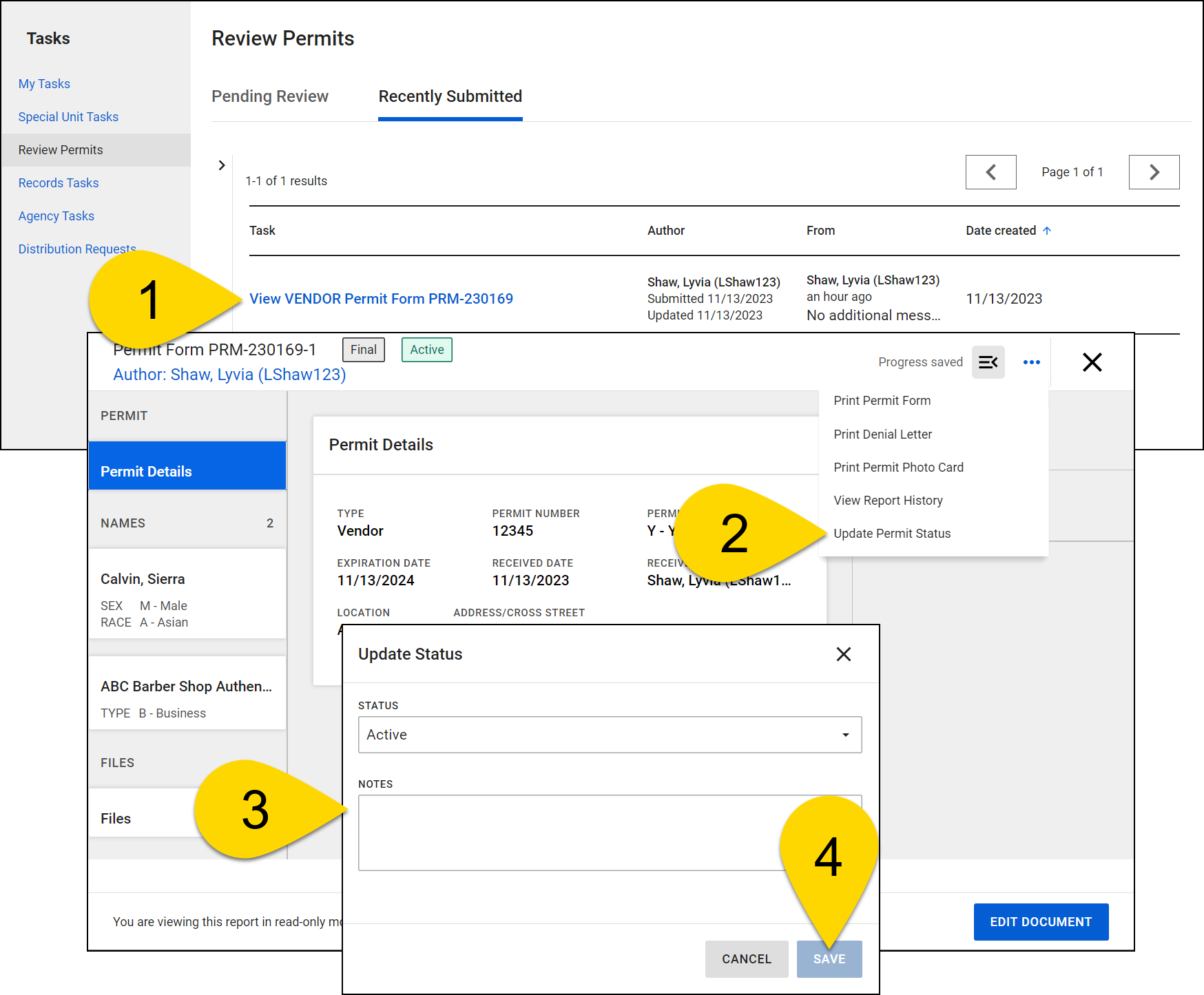 Once a permit has been created and either approved or denied, additional management steps may include: