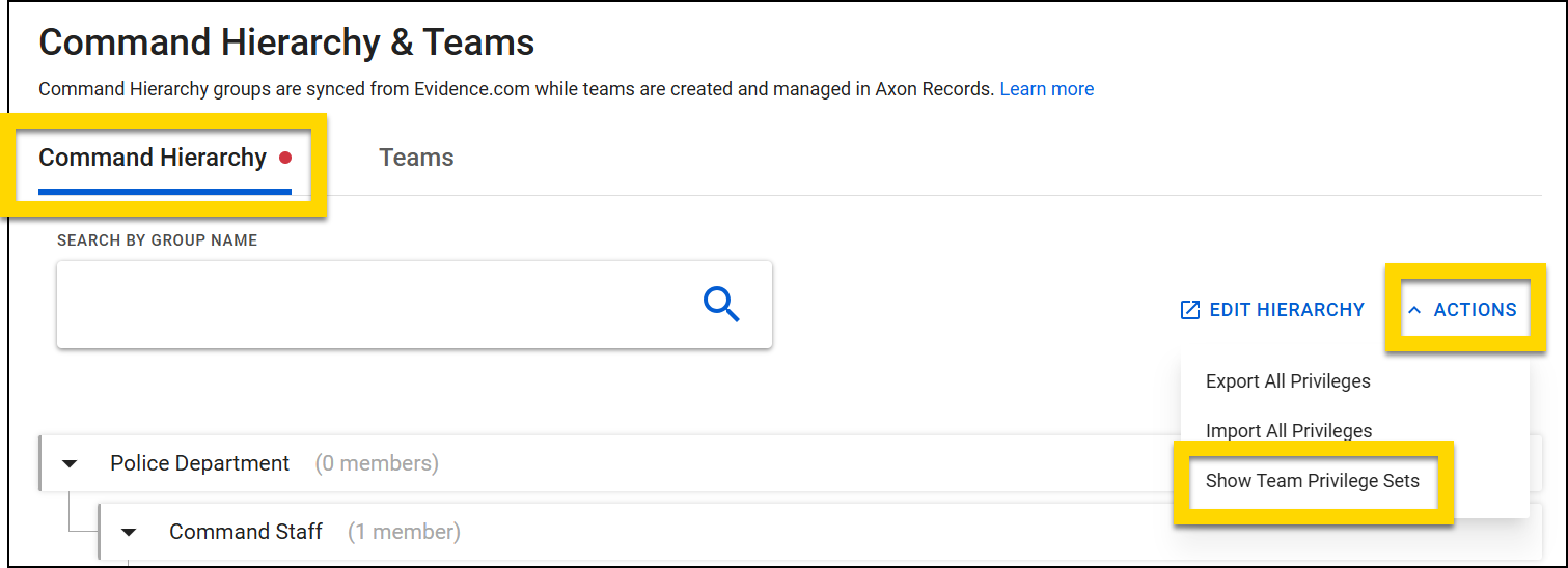 You can also export and import privileges for all teams or groups from the Actions menu on the main Command Hierarchy & Teams page. This function allows you to copy all existing teams and privileges to a new account. Contact your Axon representative for more information about this functionality.