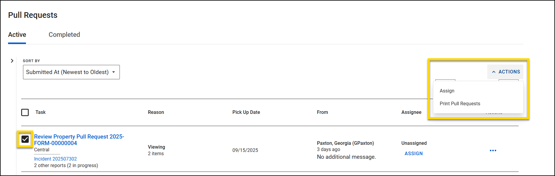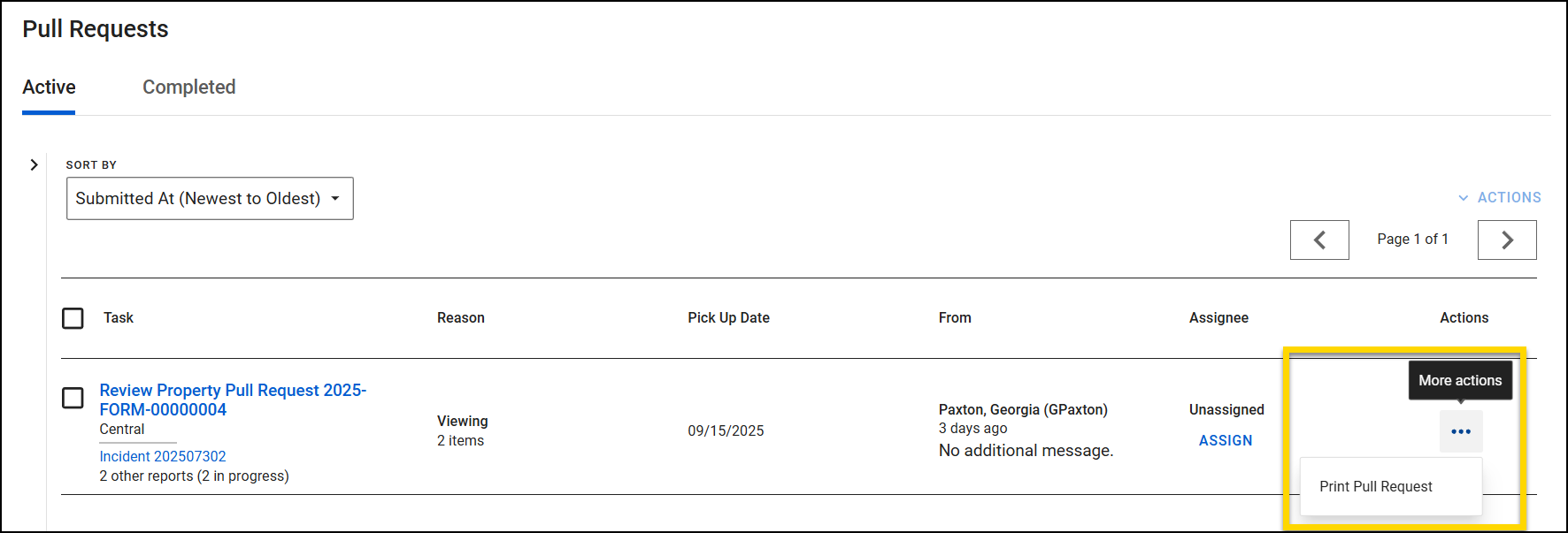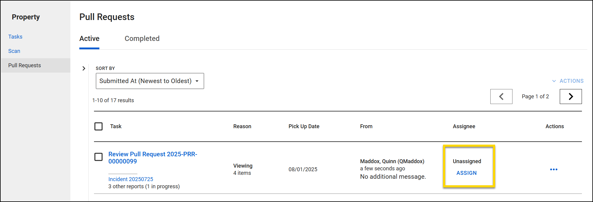After an officer submits a pull request, it appears in the Property module in the Pull Requests inbox. By default, the Pull Requests inbox opens to the Active tab and displays all active pull requests starting with the most recent. From here, you can take the following actions: