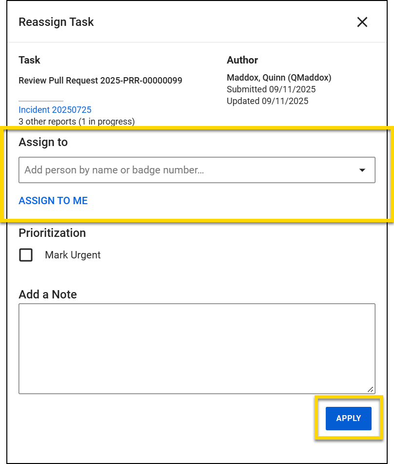 After you select Assign, you can enter the name of the person you want to assign the pull request to, or select Assign to me if you want to assign it to yourself. You can also mark the request as urgent or add a note, if needed. When you are done, select Apply.