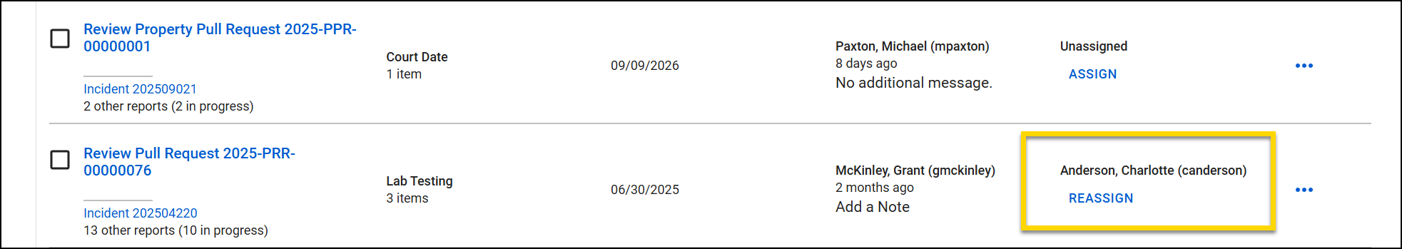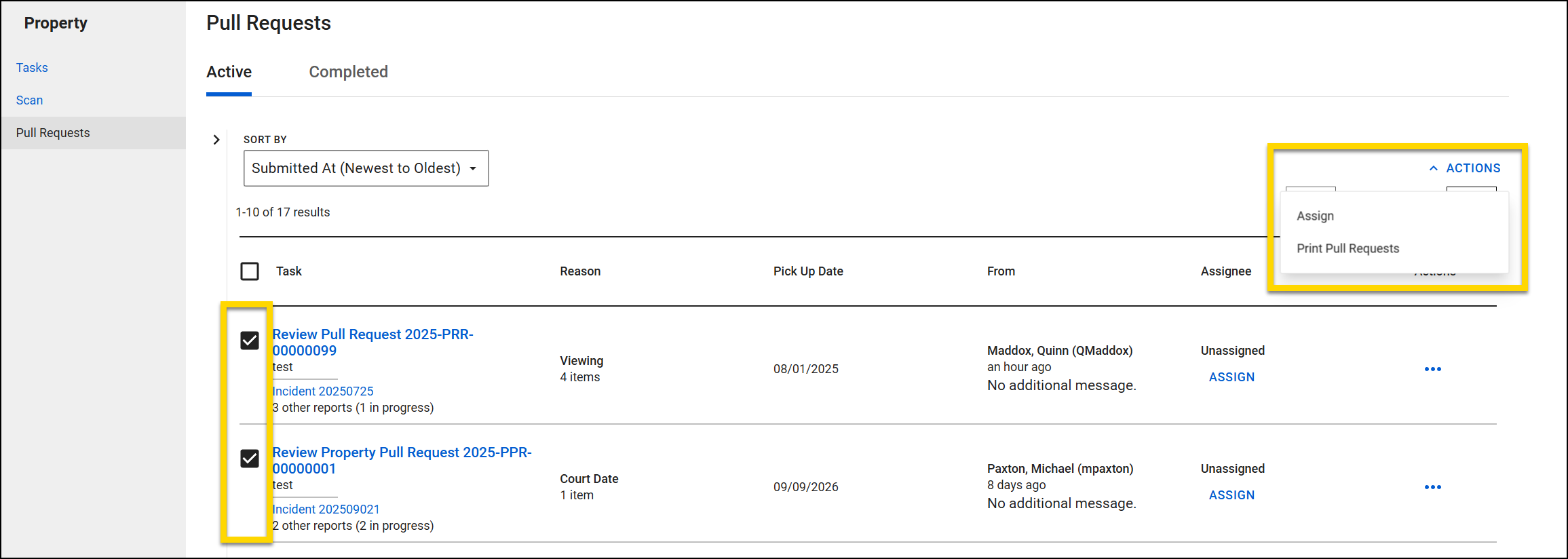 The pull request feature allows users to request specific property items for pickup directly from an incident report. Each pull request can only include property items from the same report. If you need to pull items from multiple reports, you'll need a separate pull request for each report. If an item hasn't been submitted, it must be submitted before it can be added to the request.