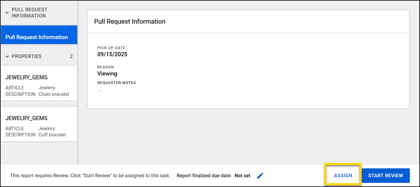 The Print Pull Request option in the Pull Request inbox differs from the one available when you have a pull request open. Printing from the inbox generates a summary that includes property item locations. Printing from an open pull request provides a detailed pull request report, and will not include the location of the items.