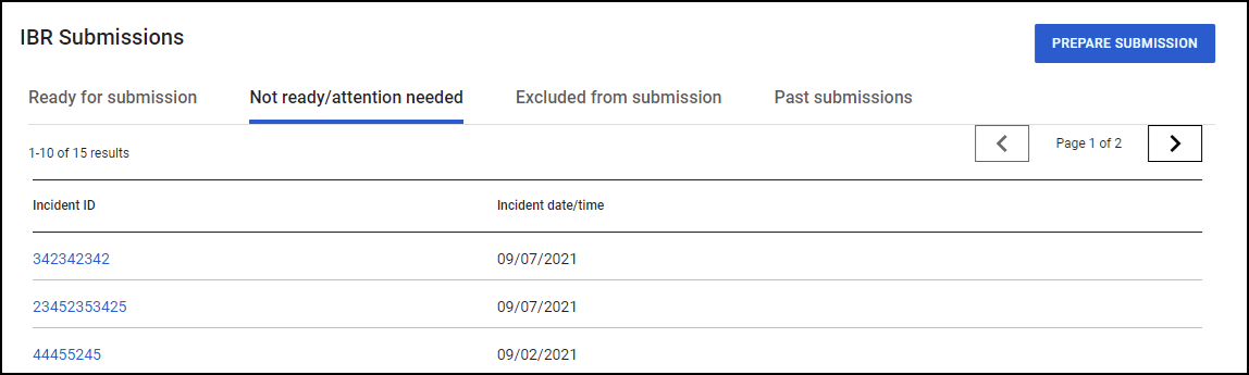 This tab contains the list of incidents ready for submission.