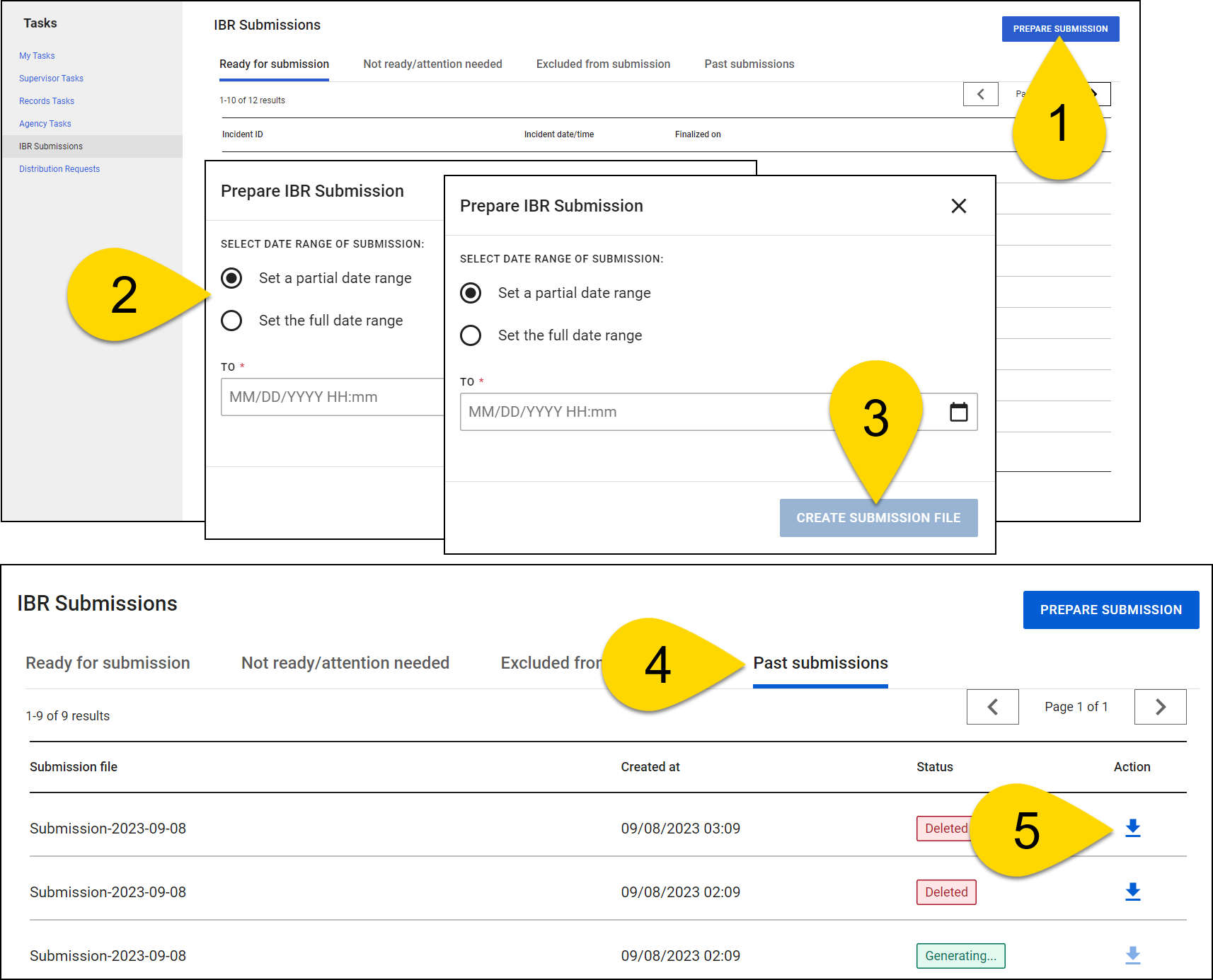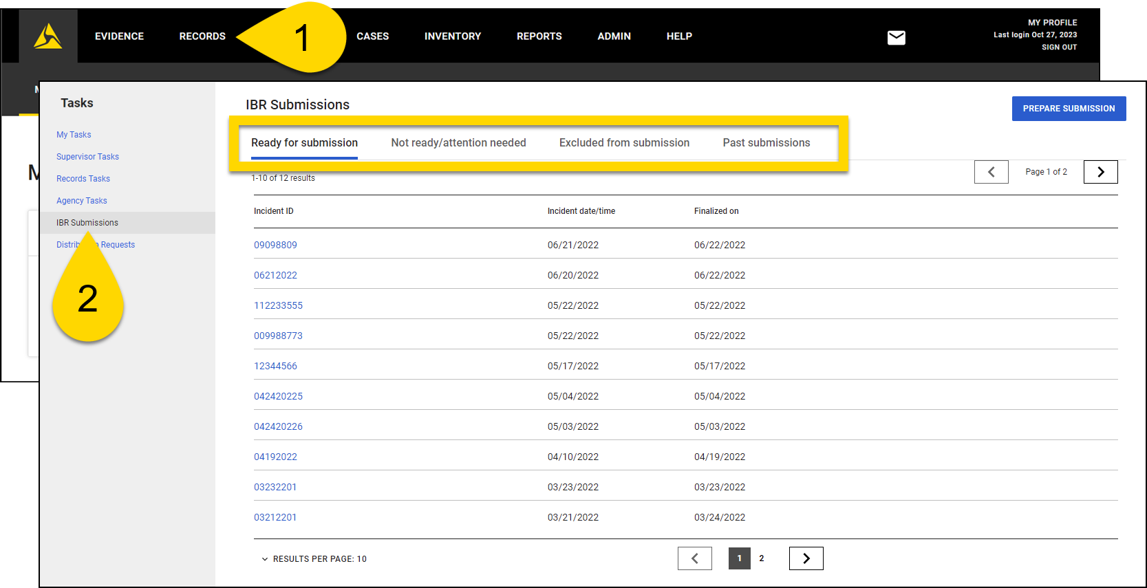 The Incident Based Reporting (IBR) submission service is an Axon Records feature that lets organizations download batch submissions for FBI National Incident Based Reporting Systems (NIBRS). Contact your Axon representative to have this feature activated for your organization.