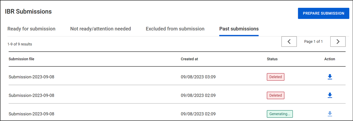 After a submission file has been prepared in the IBR Submission Service, you can open the Past Submissions tab to find the submissions file that can be sent to the state repository.