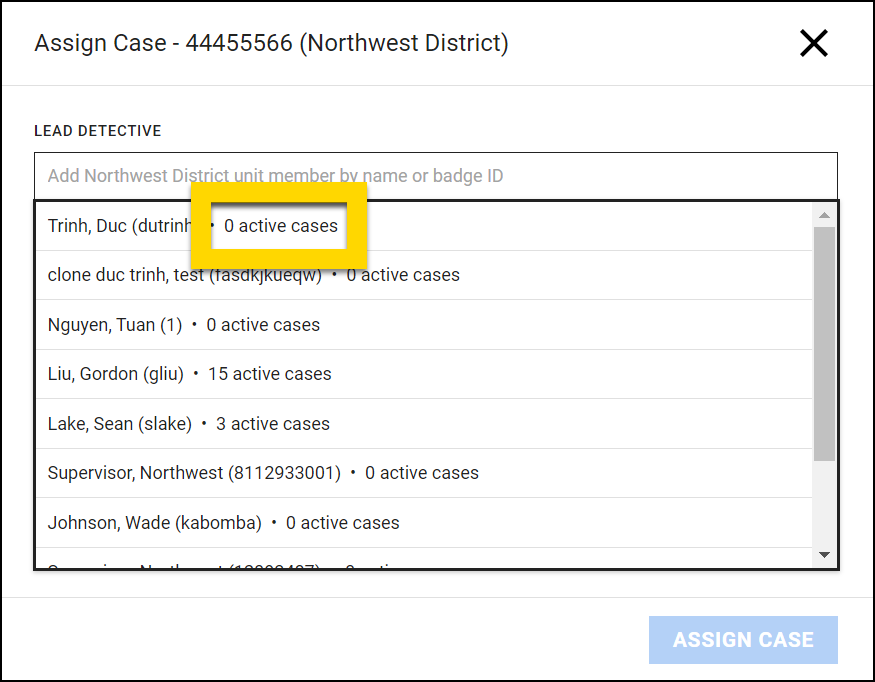 Caseload visualization gives a supervisor information to balance work more effectively when assigning investigations. When you assign a new investigation or transfer an existing investigation, the options in the Lead detective field display the number of active cases and investigations currently assigned to each detective in that unit.