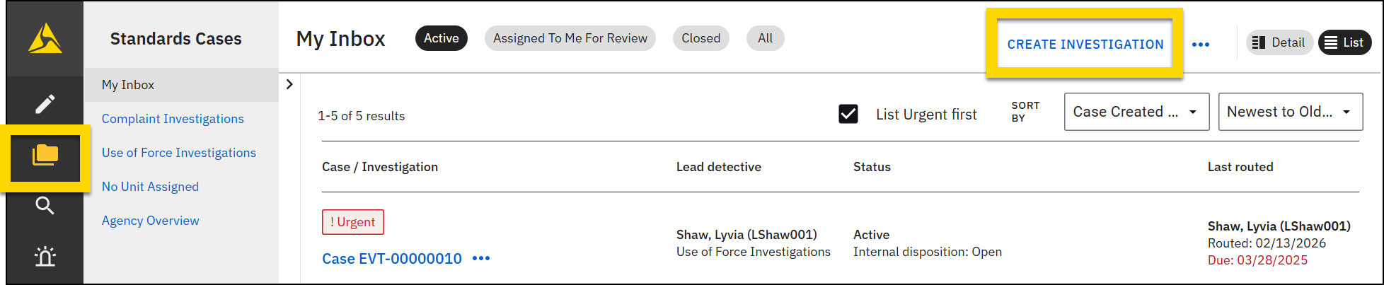 To manage an investigation's lead detective, a user must have the Triage privileges for the unit currently assigned to the investigation. To update an investigation's lead detective: