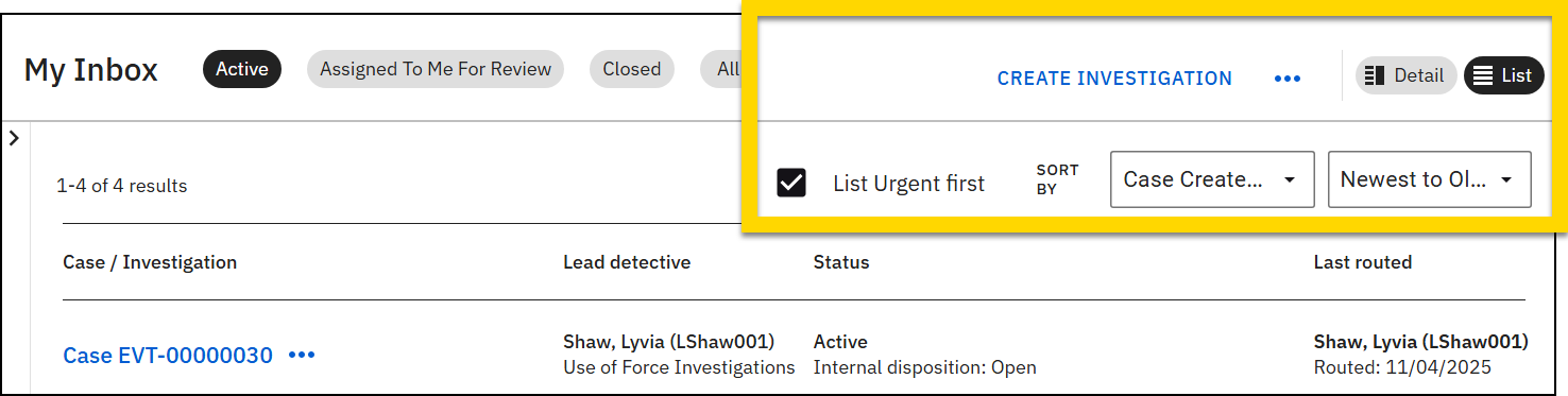 - Select the List urgent first checkbox to pull any cases or investigations marked as Urgent to the top of the list.