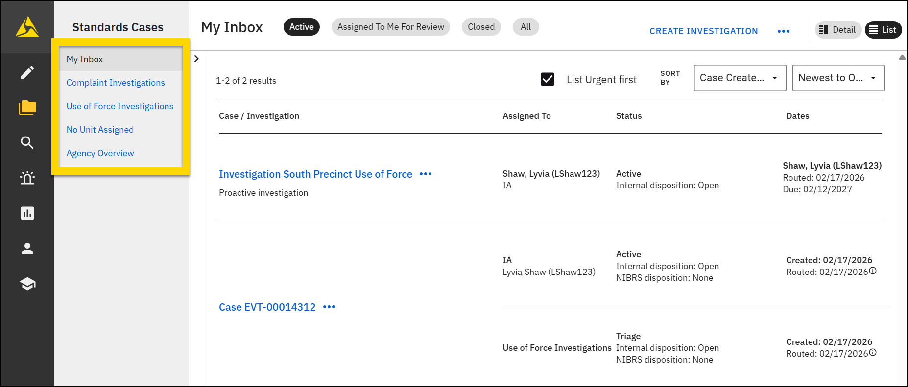 - Agency Overview: All cases and investigations across the organization. This inbox is generally used by supervisors to help them understand all investigative work being done by the organization.