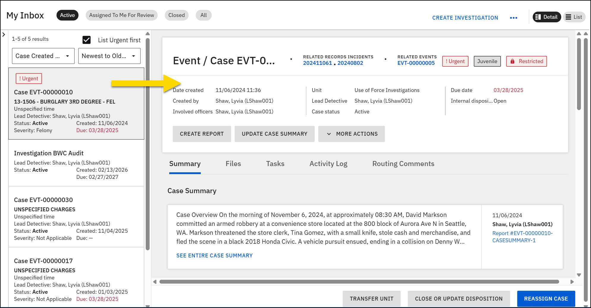 - Unit inboxes: Cases and investigations owned by your team (e.g. Robbery, IA Investigations, etc.).