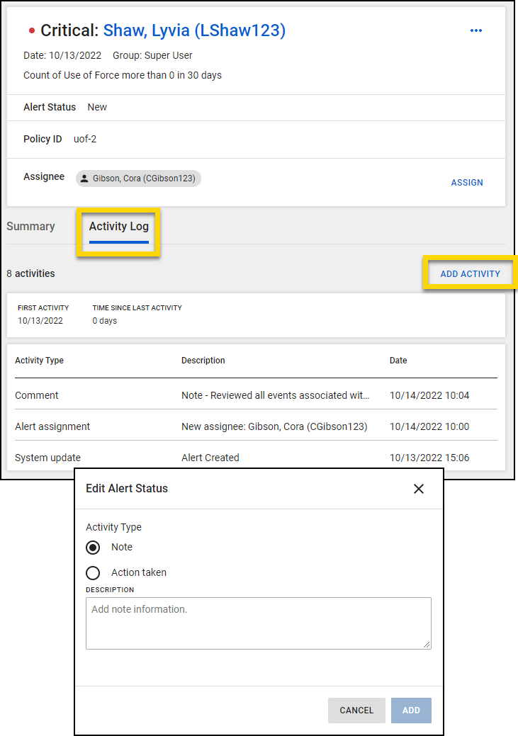 Open the Activity Log to view all activities for that alert. Select Add Activity to add an activity to the log. You can include a note or describe an action that was taken.