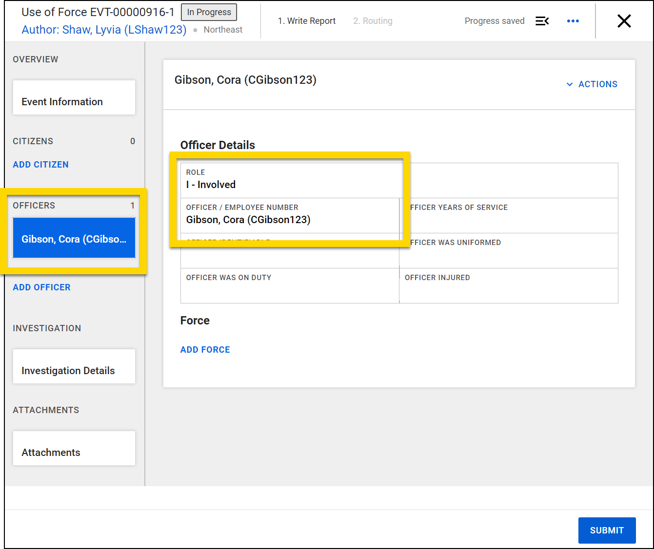 An officer's involvement in an event isn't tracked to an EIS policy until the report is submitted for review. This prevents unnecessary alerts of officers being added to a report by mistake during report drafting.