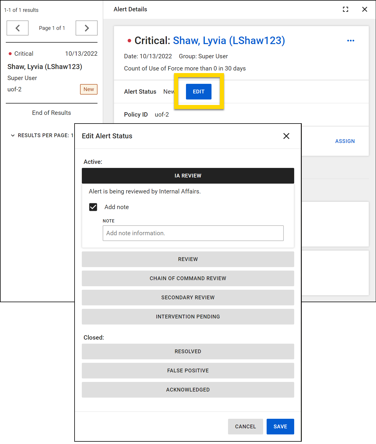 If you have been assigned to review an EIS alert, you can select Edit to update the alert status. You can select from the following status options: