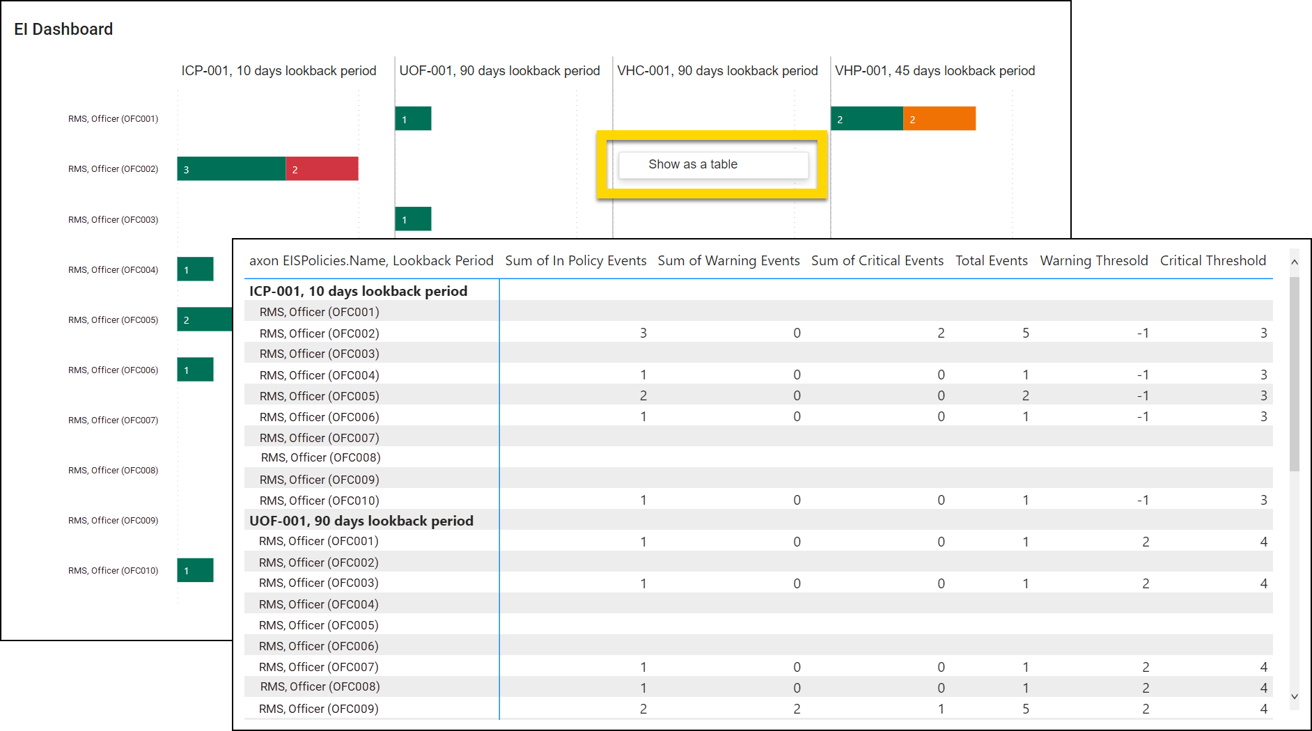 The EI Dashboard is organized in a table format. Each row is dedicated to a single officer. Each column indicates a specific policy and lookback period. The lookback period starts on the current day and looks back in time for the rolling timeframe specified by the policy.