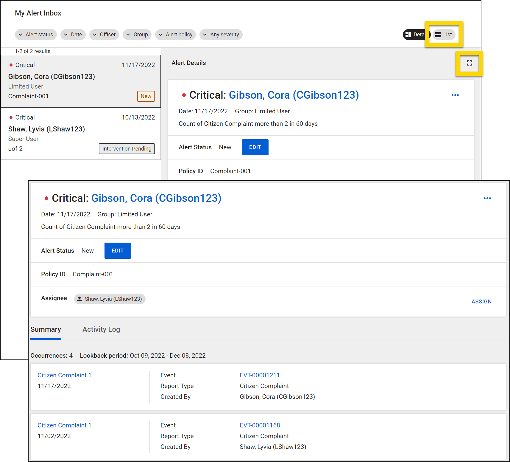 Selecting an alert from either EIS inbox condenses the alert list and opens the Alert Details beside it. To view this page as a full screen, select the full-screen icon. The alert will open in a new browser tab where you can view all information about the alert and take action. Select List to close the Alert Details window and continue browsing the alert list.