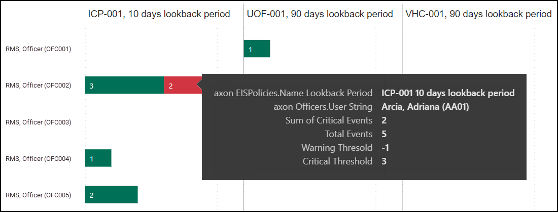 - Red, Critical Events: The number of events the officer was involved in triggered a critical alert for that policy.