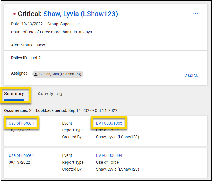 View the events associated with an alert on the Summary tab. Select the report name to open the report in a new browser tab. Select the Event ID to open the event profile in a new browser tab.