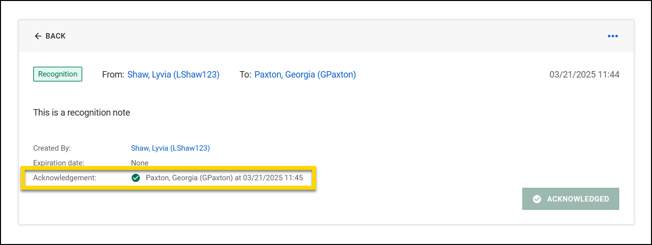 When the sender requires acknowledgment from the recipient, an Acknowledge button will appear in the note.