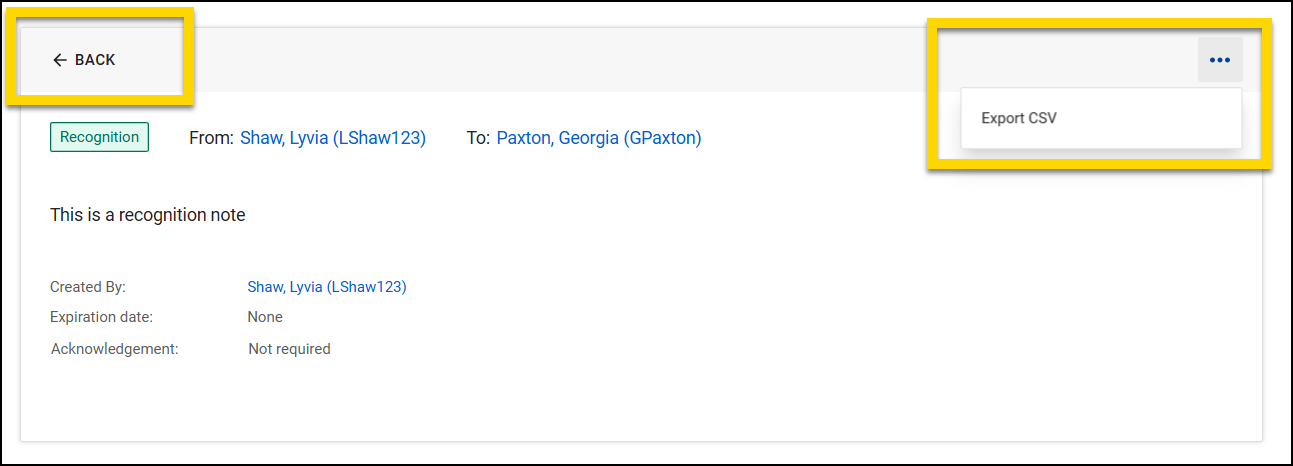 To export a note, open it, select More Actions [...] > Export CSV. To return to the list of notes, select Back.