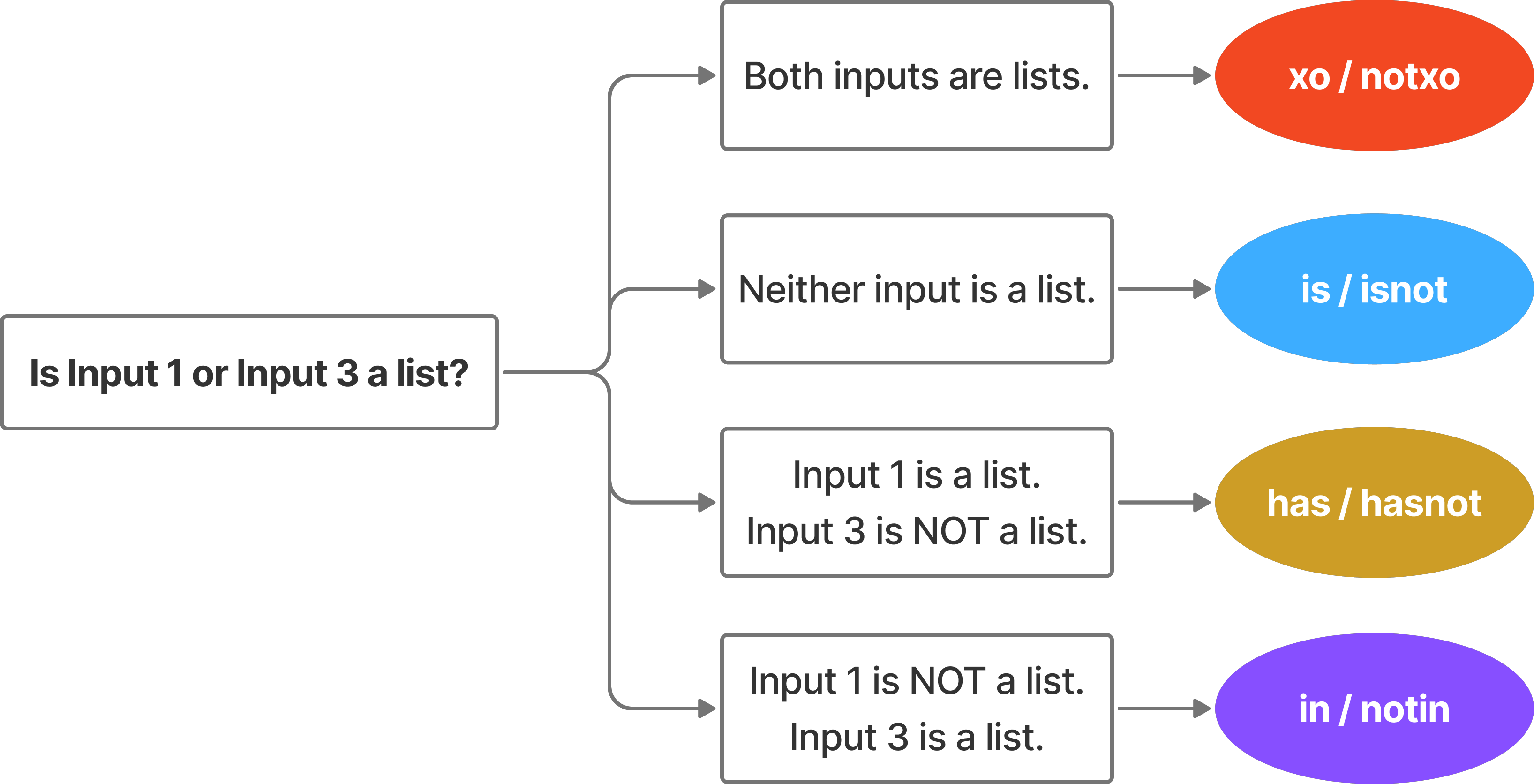 When creating Skip, Only, and Compute expressions, it can be challenging to determine which comparator to use. For these expressions, Input 2 is always the comparator. The illustration below explains how Inputs 1 and 3 determine which comparator you should use: