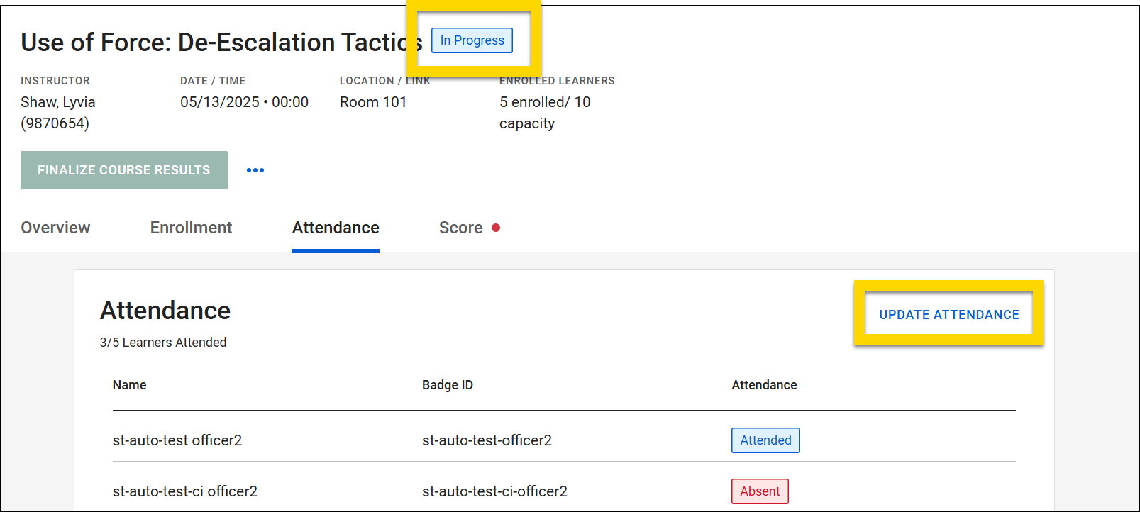 Once you record attendance for a course, the course status changes from Upcoming to In Progress. To update attendance for a learner: